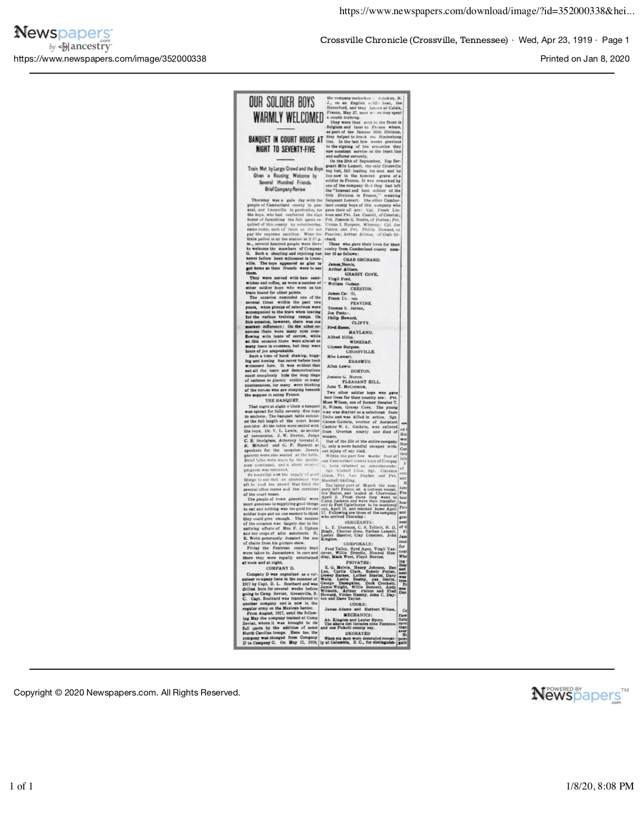 After graduation, Milo journeyed to Wyoming where he sheared sheep, regularly sent money home to help with the expenses of operating the family farm and feeding his siblings. When WWI broke out, Cumberland County, Tennessee was one of the few counties in the state to meet its enlistment quota, with brothers Milo and Nathan joining the Tennessee National Guard.