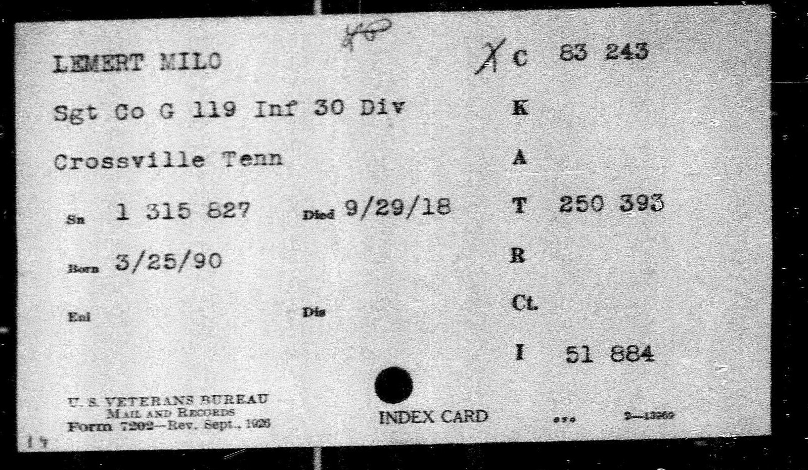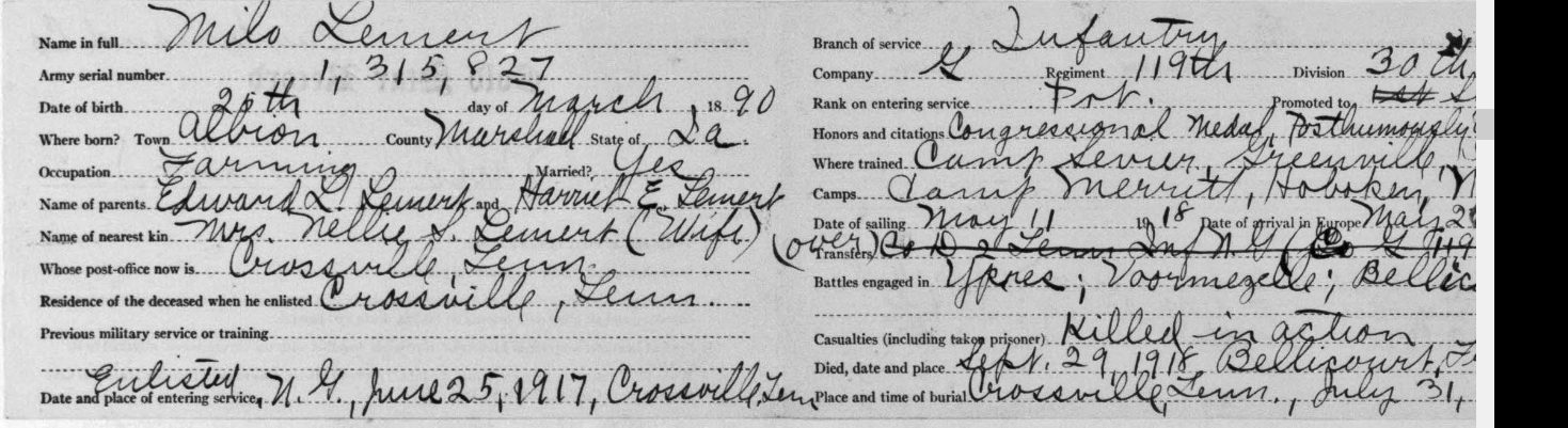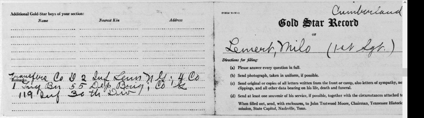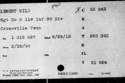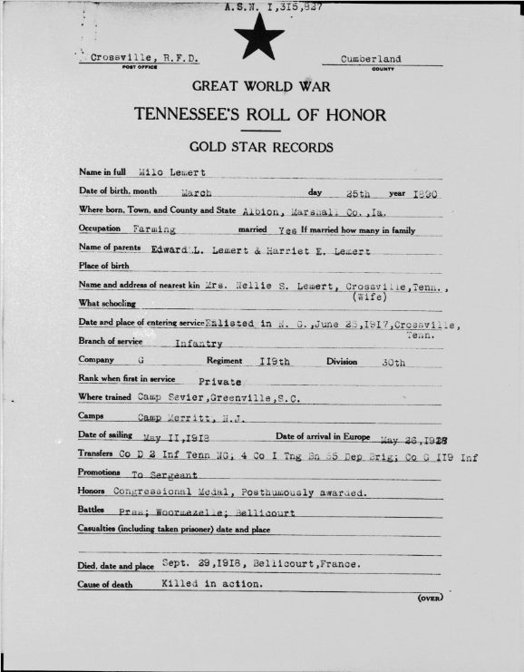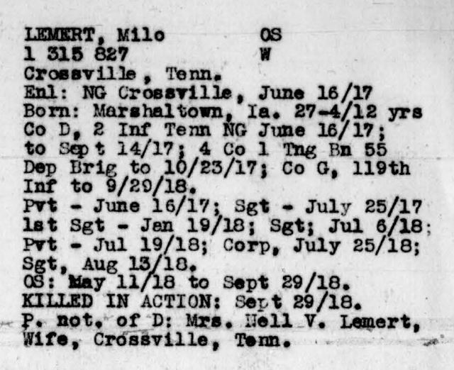 First Sergeant Milo Lemert was born in Marshalltown, Iowa on March 25, 1890. He was a farmer before his enlistment on June 25, 1917 at Crossville, Tennessee. He trained at Camp Sevier, Greenville, South Carolina, and Camp Merritt, New Jersey. He served with Company G, 119th Infantry Regiment, 30th Division. He sailed to Europe on May 11, 1918, arriving on May 26, 1918. He was killed in action at Bellicourt, France on September 29, 1918 and buried at Crossville City Cemetery, Crossville, Cumberland County on July 31, 1921. He was the husband of Nellie V. Lemert of Crossville.