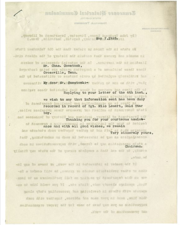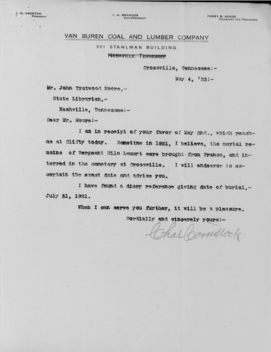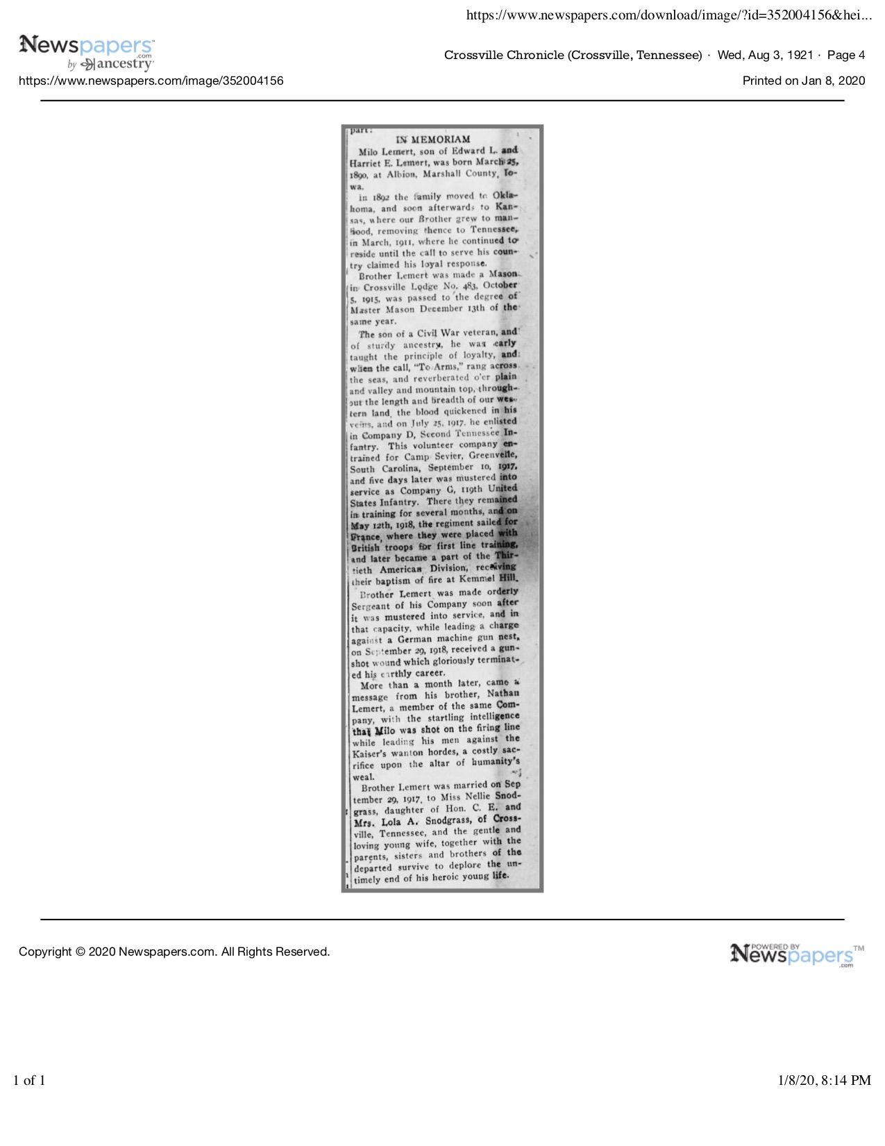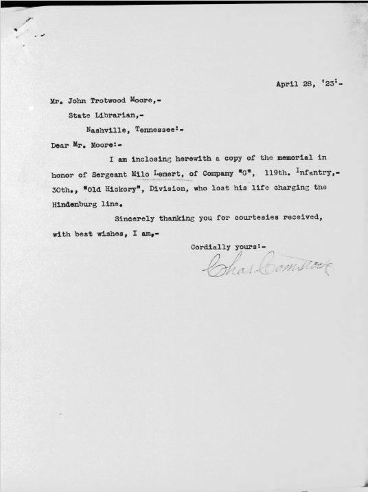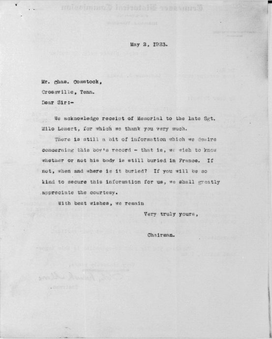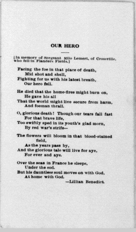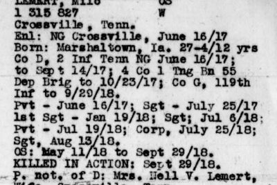 First Sergeant Milo Lemert was born in Marshalltown, Iowa on March 25, 1890. He was a farmer before his enlistment on June 25, 1917 at Crossville, Tennessee. He trained at Camp Sevier, Greenville, South Carolina, and Camp Merritt, New Jersey. He served with Company G, 119th Infantry Regiment, 30th Division. He sailed to Europe on May 11, 1918, arriving on May 26, 1918. He was killed in action at Bellicourt, France on September 29, 1918 and buried at Crossville City Cemetery, Crossville, Cumberland County on July 31, 1921. He was the husband of Nellie V. Lemert of Crossville.