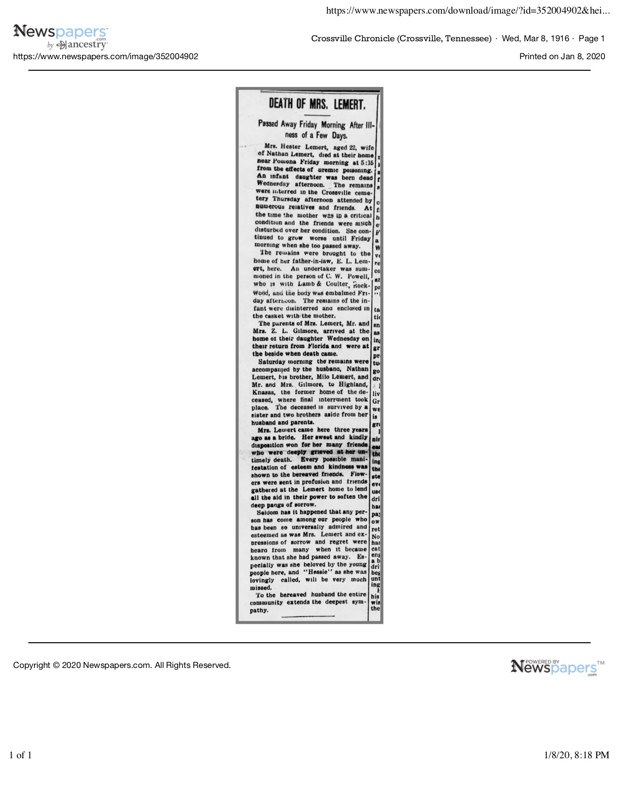 Nell Vaughn Lemert – dob: 4/11/1890 – Crossville, TN