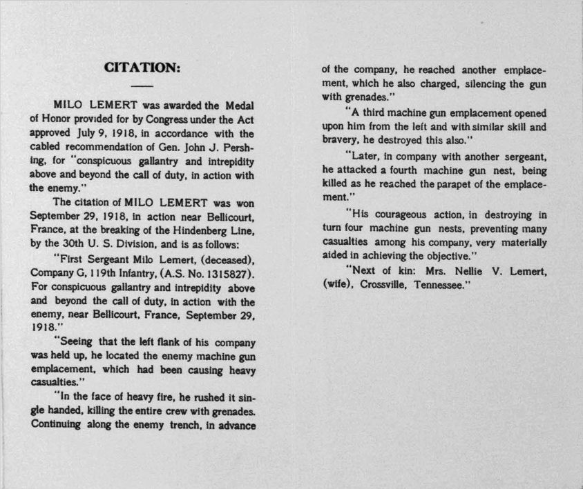 Lemert, Milo – First Sergeant, US Army, Company G, 119th Infantry, 30th Division — Near Bellicourt, France. 29 September 1918 – G.O. No. 59, WD, 1919.