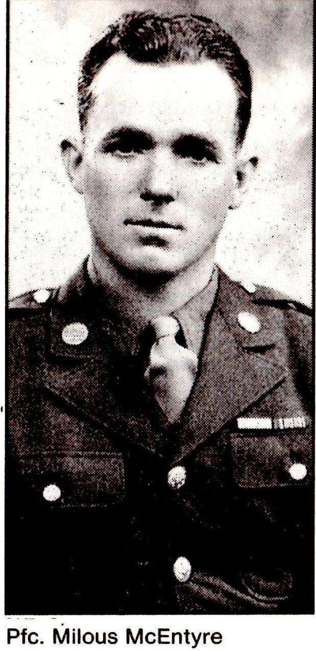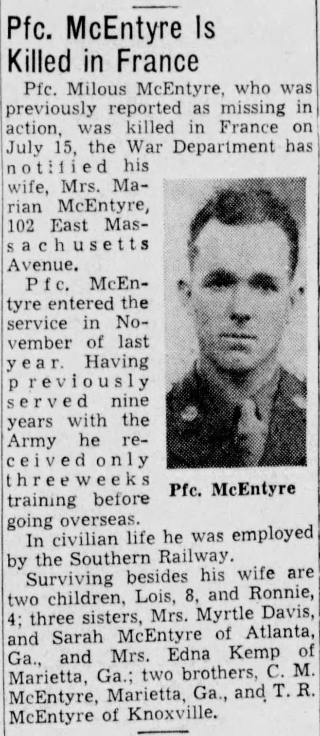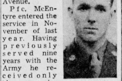 McEntyre had served 9 years, previously. When he entered the Army again, in November, 1943, he received only three weeks training. He would live only seven months.