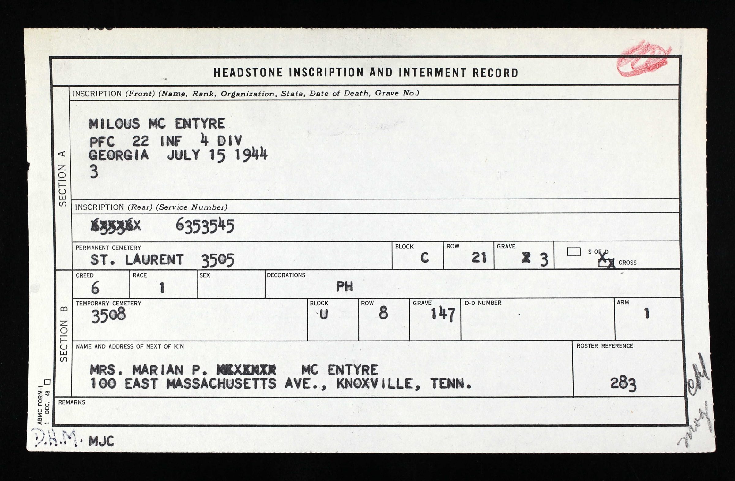 Milous McEntyre was initially buried at Blosville Cemetery at Carentan, France and reburied in the Normandy American Cemetery in Colleville-sur-Mer, France , C, 21, 3
