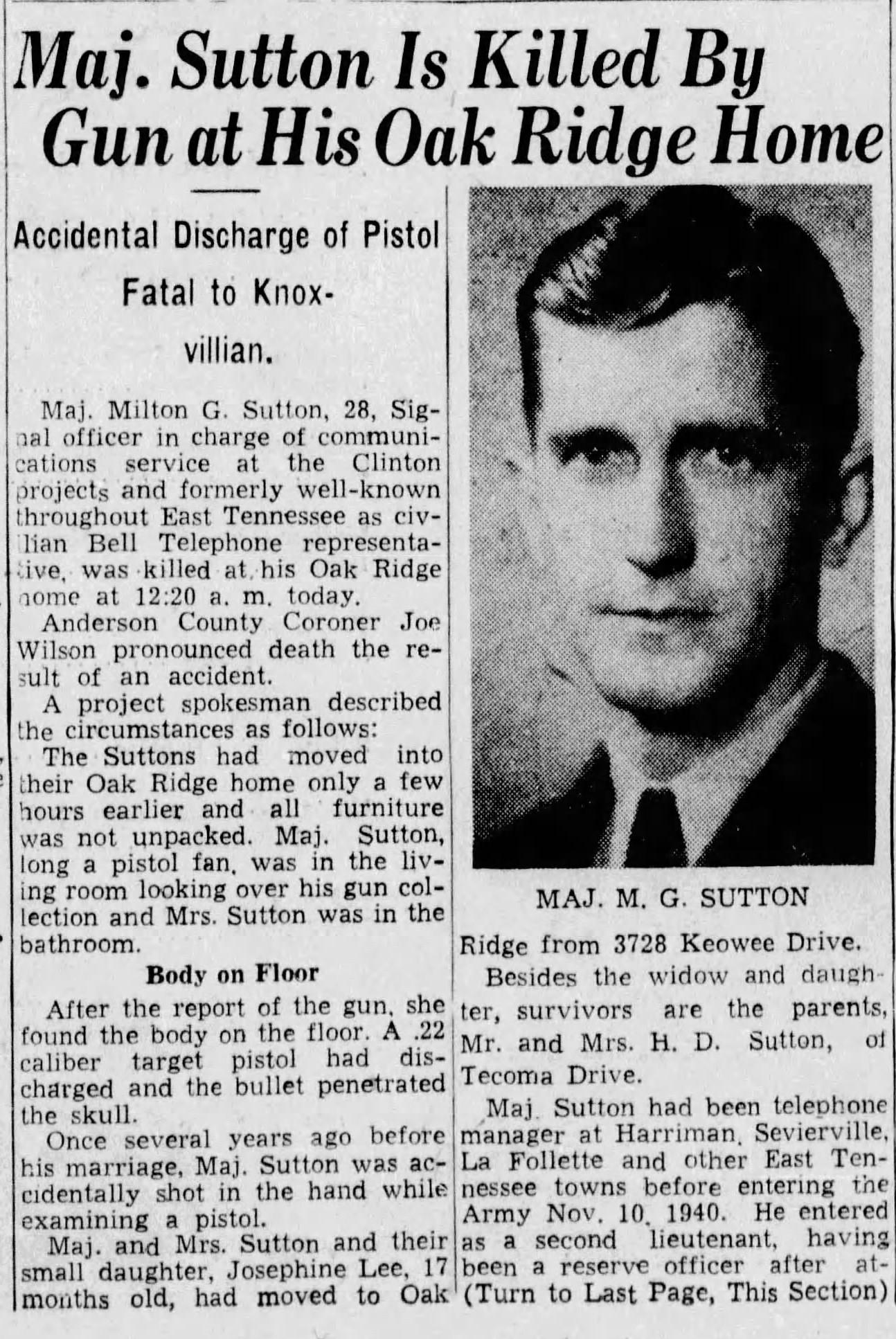 Maj. Milton G. Sutton, 28, Signal officer in charge of communications service at the Clinton projects and formerly well-known throughout East Tennessee as civilian Bell Telephone representative was killed at Oak Ridge home at 12:20 a.m. today. Andercon County Coroner Joe Wilson pronounced death the result of an accident. A project spokesman described the circumstances as follows: The Suttons had moved into their Oak Ridge home only a few hours earlier and all furniture was not unpacked. Maj. Sutton, long a pistol man, was in the living room looking over his gun collection and Mrs. Sutton was in the bathroom. After the report of the gun, she found the body on the floor. A .22 caliber target pistol had discharged and the bullet penetrated his skull. Once several years ago before his marriage, Maj. Sutton was accidentally shot in the hand while examining a pistol. Maj. And Mrs. Sutton and their small daughter, Josephine Lee, 17 months old, had moved to Oak Ridge from 3728 Keowee Drive. Besides his widow and daughter, survivors are the parents, Mr. and Mrs. H.D. Sutton, of Tecoma Drive. Maj. Sutton had been telephone manager at Harriman, Sevierville, La Follette and other East Tennessee towns before entering the Army Nov. 10, 1940. He entered as a second lieutenant, having been a reserve officer, after attending University of Tennessee ROTC.