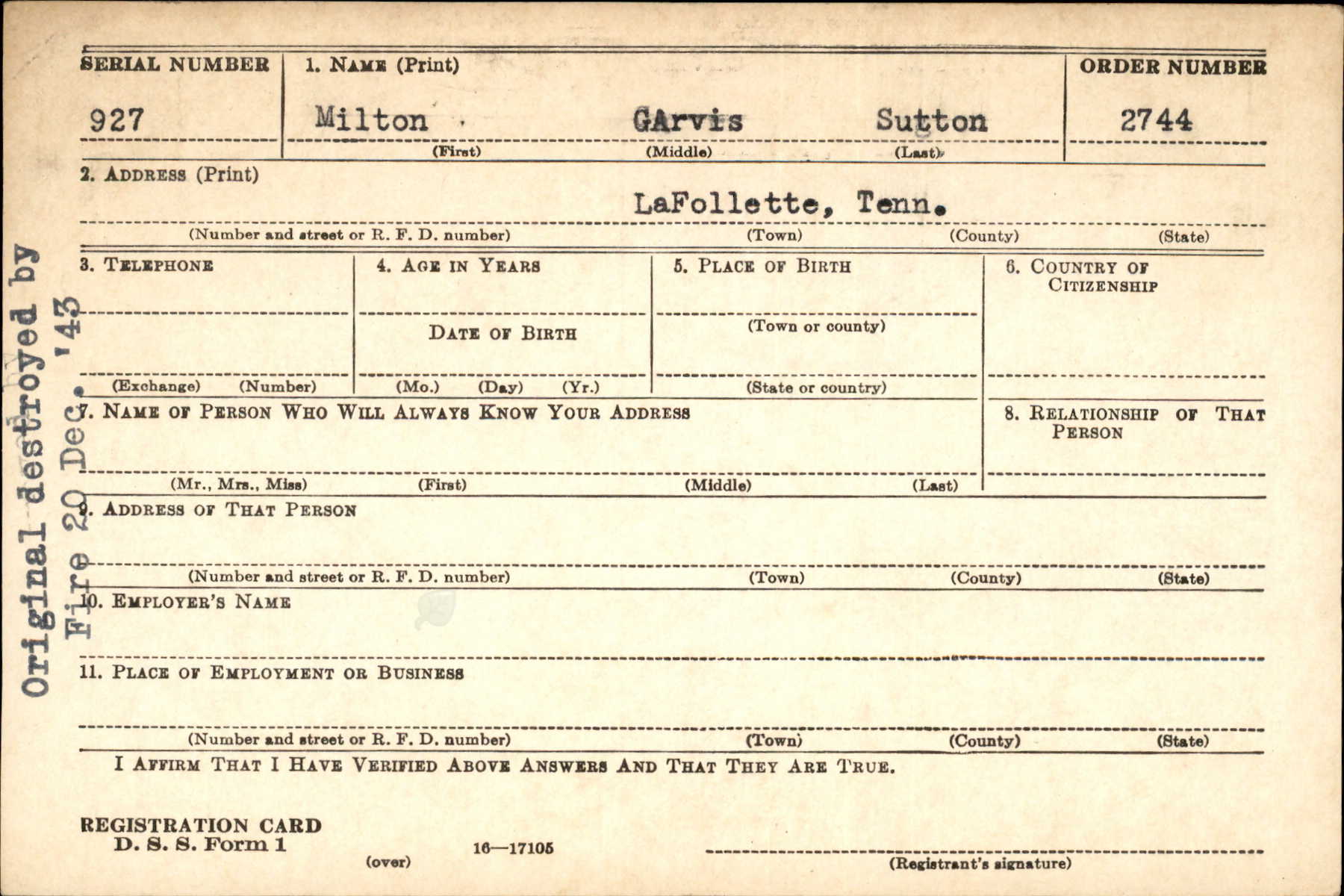 Milton Garvis Sutton was born 21 February 1916 at Albany, Alabama.