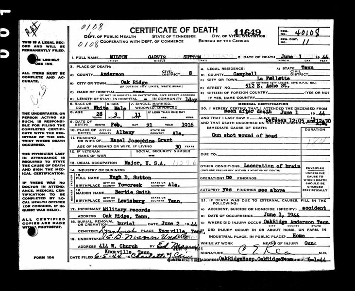 Major Sutton died of an accidental gunshot wound that occurred in Oak Ridge, Anderson County, Tennessee.