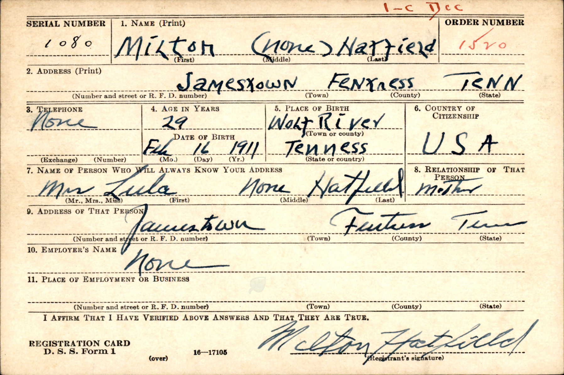 Milton Hatfield was born at Wolf River, Tennessee, the son of Nimrod Hatfield and Lula Harding.