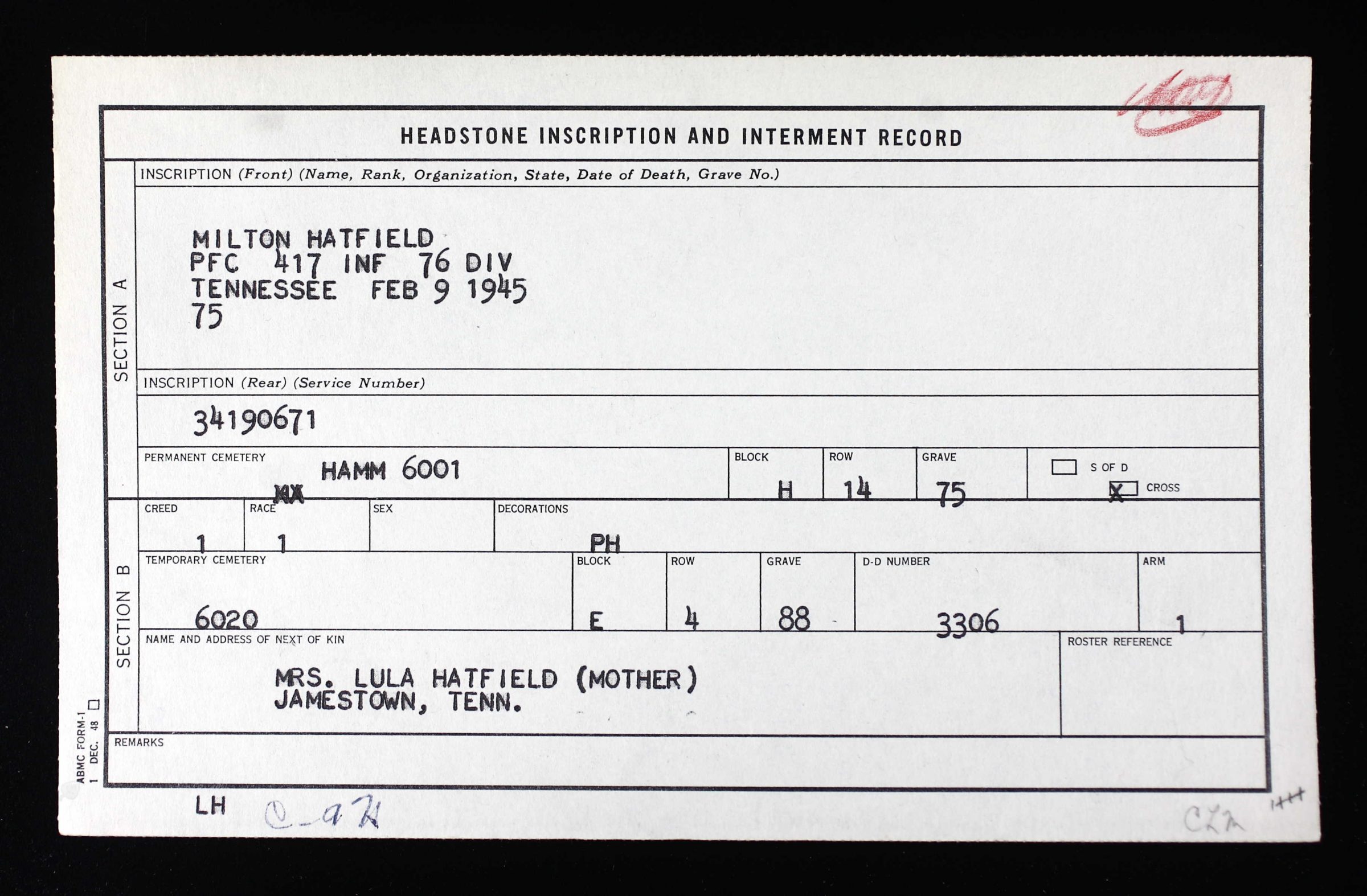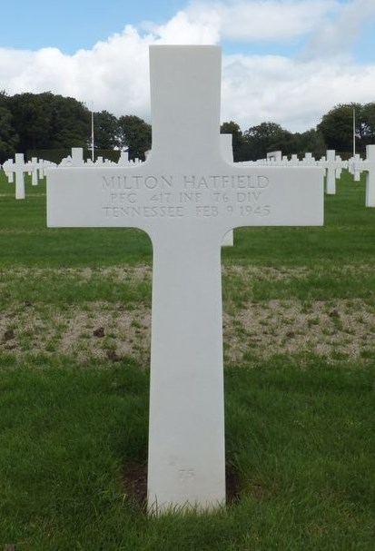Private First Class Milton Hatfield #34190671 US Army was assigned to the 417th Infantry Regiment of the 76th Infantry Division. The Division arrived in England on 20th of December 1944. Received additional training and then reboarded ships and crossed to Le Havre, France on the 12th of January 1945.