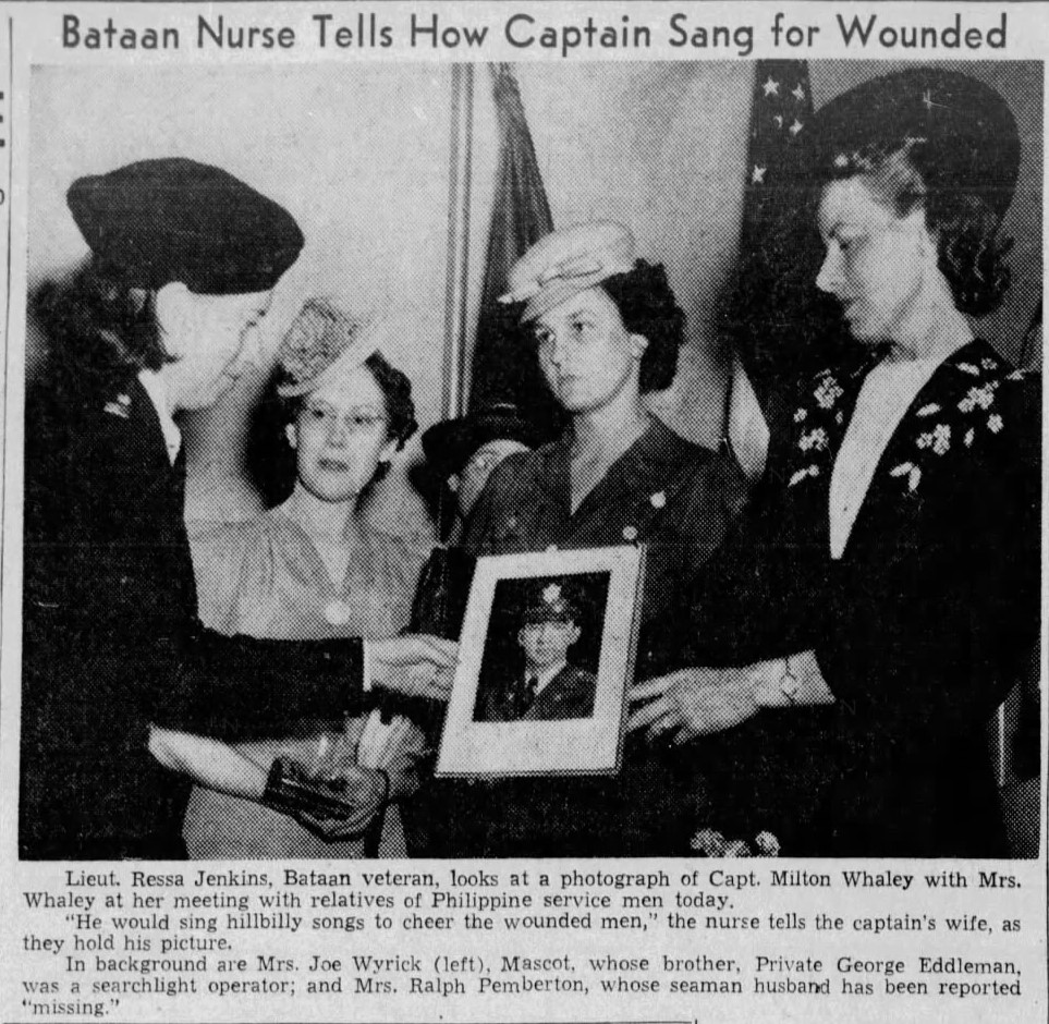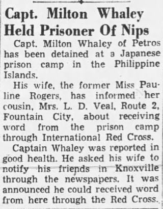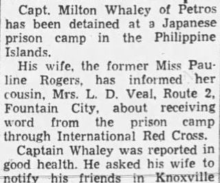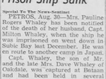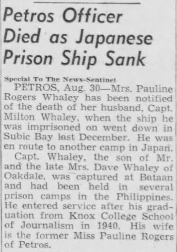Mrs. Pauline Rogers Whaley has been notified of the death of her husband, Capt. Milton Whaley, when the ship he was imprisoned on went down in Subic Bay last December. He was en route to another camp in Japan. Capt. Whaley, the son of Mr. and the late Mrs. Dave Whaley of Oakdale, was captured in Bataan and had been held in several prison camps in the Philippines. He entered the service after his graduation from Knox College School of Journalism in 1940. His wife is the former Miss Pauline Rogers of Petros.