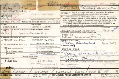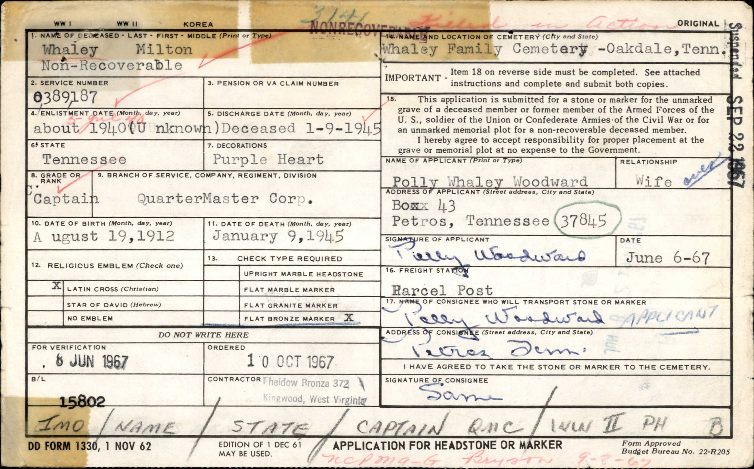 Captain Milton Whaley, who entered the U.S. Army from Illinois, served with the 12th Quartermaster Corps in the Philippines during World War II. He was taken as a POW following the Japanese invasion and interned in the islands until December 1944, when he was put aboard the Oryoku Maru for transport to Japan. Records indicate CPT Whaley was killed several weeks later in the attack on the Enoura Maru; however, these reports often involve information solely furnished by enemy governments, with some casualties given multiple dates of death. Future research may determine that these reports were inaccurate. Captain Whaley’s remains could not be identified following the war, and he is still unaccounted-for. Today, Captain Whaley is memorialized on the Walls of the Missing at the Manila American Cemetery in the Philippines.