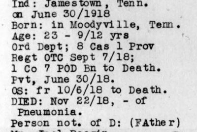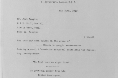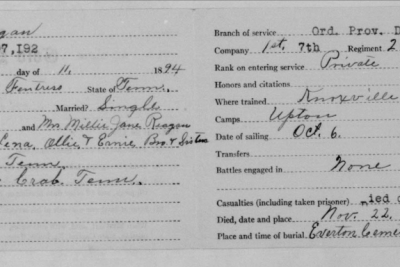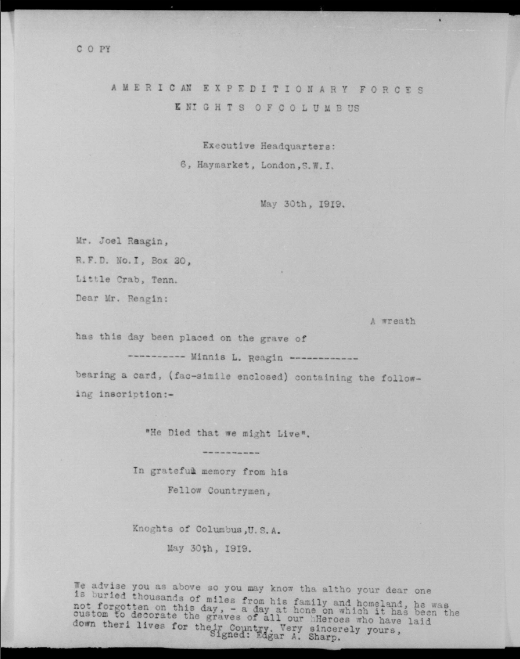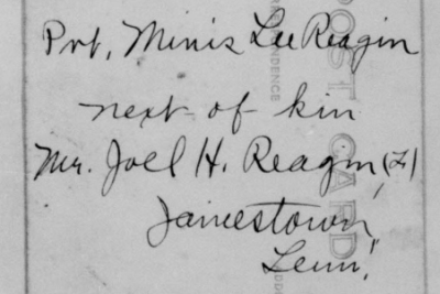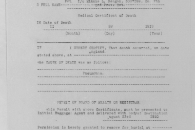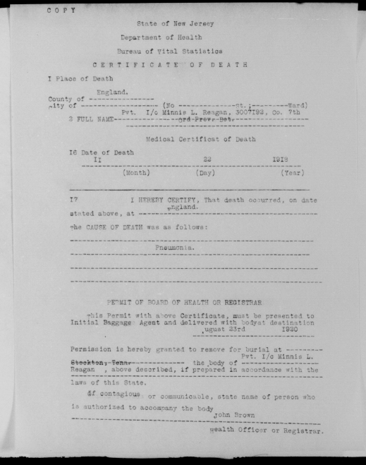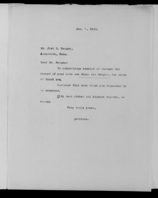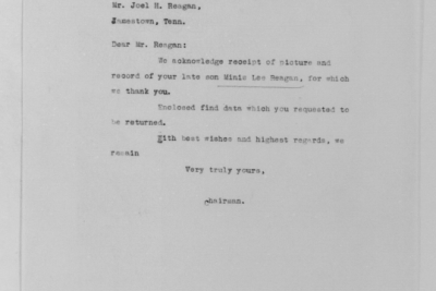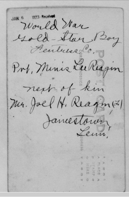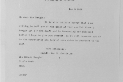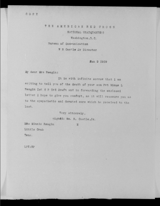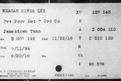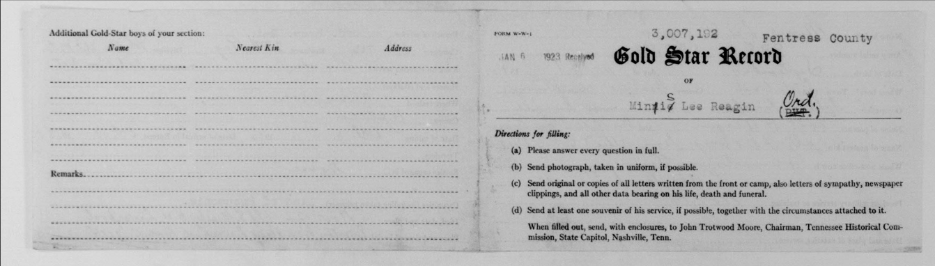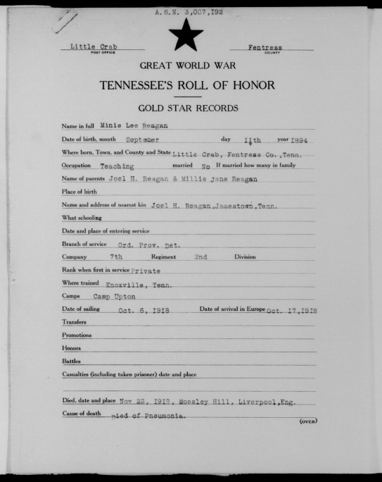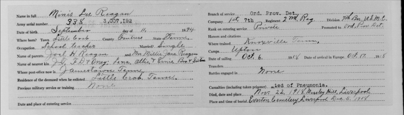 Minis Lee Reagan was born 11 September 1894 in Moodyville, Tennessee to Joel H. and Millie Jane Reagan. He entered the service at Little Crab and received training in Knoxville, Tennessee. He sailed to Europe October 6, 1918 arriving on October 17.