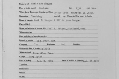 Minis Reagan was a farmer prior to his induction on 30 June 1918 at the University of Tennessee, Knoxville, Tennessee.