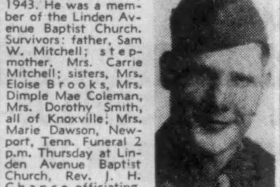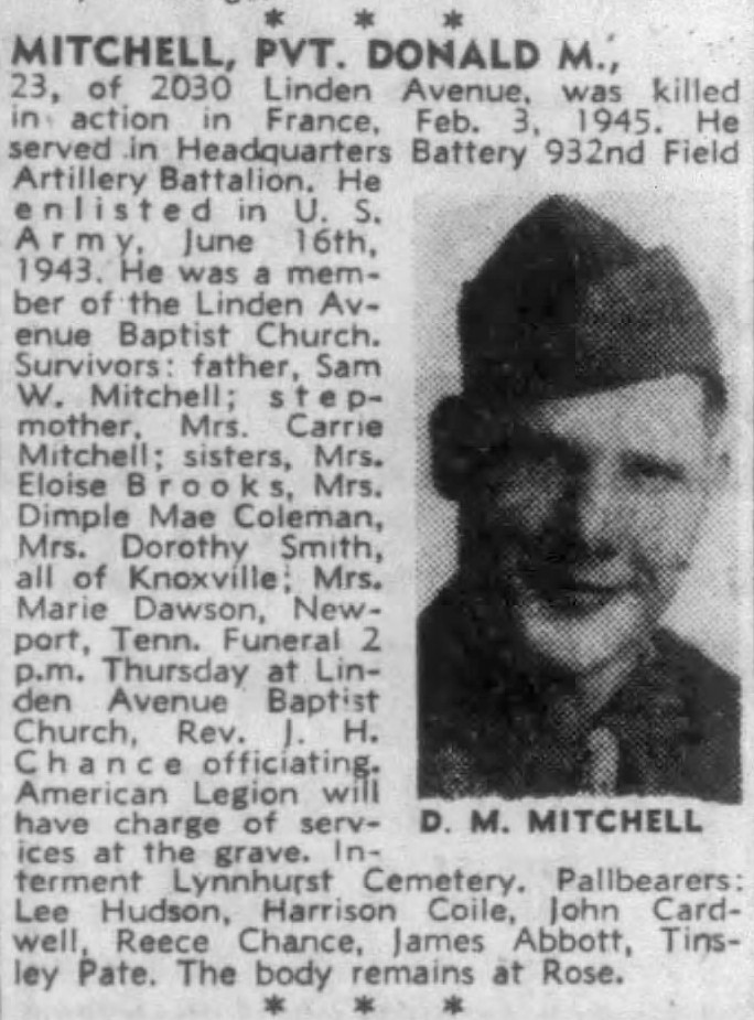 Pfc. Donald Mitchell, son of Mr. and Mrs. Sam Mitchell, 2030 Linden Avenue, was killed in action somewhere in France, Feb. 3, his parents were notified by the War Department. He was 20. Volunteering for service Jan. 16, 1943, Pfc. Mitchell trained at Camp Bowie, Tex., and went overseas Sept. 18, 1943. He saw action with the Fifth Army in Italy, and later entered some bitter campaigns against the Germans in France, where he fell in action. He was a member of Linden Avenue Baptist Church, attended Park Junior High School and worked as a mechanical helper for a truck sales company here before volunteering. Other survivors include four sisters, Mrs. Marie Dalson, Cleveland, Ohio, Mrs. Dorothy Smith, Eloise and Demple Mae Mitchell, at home.