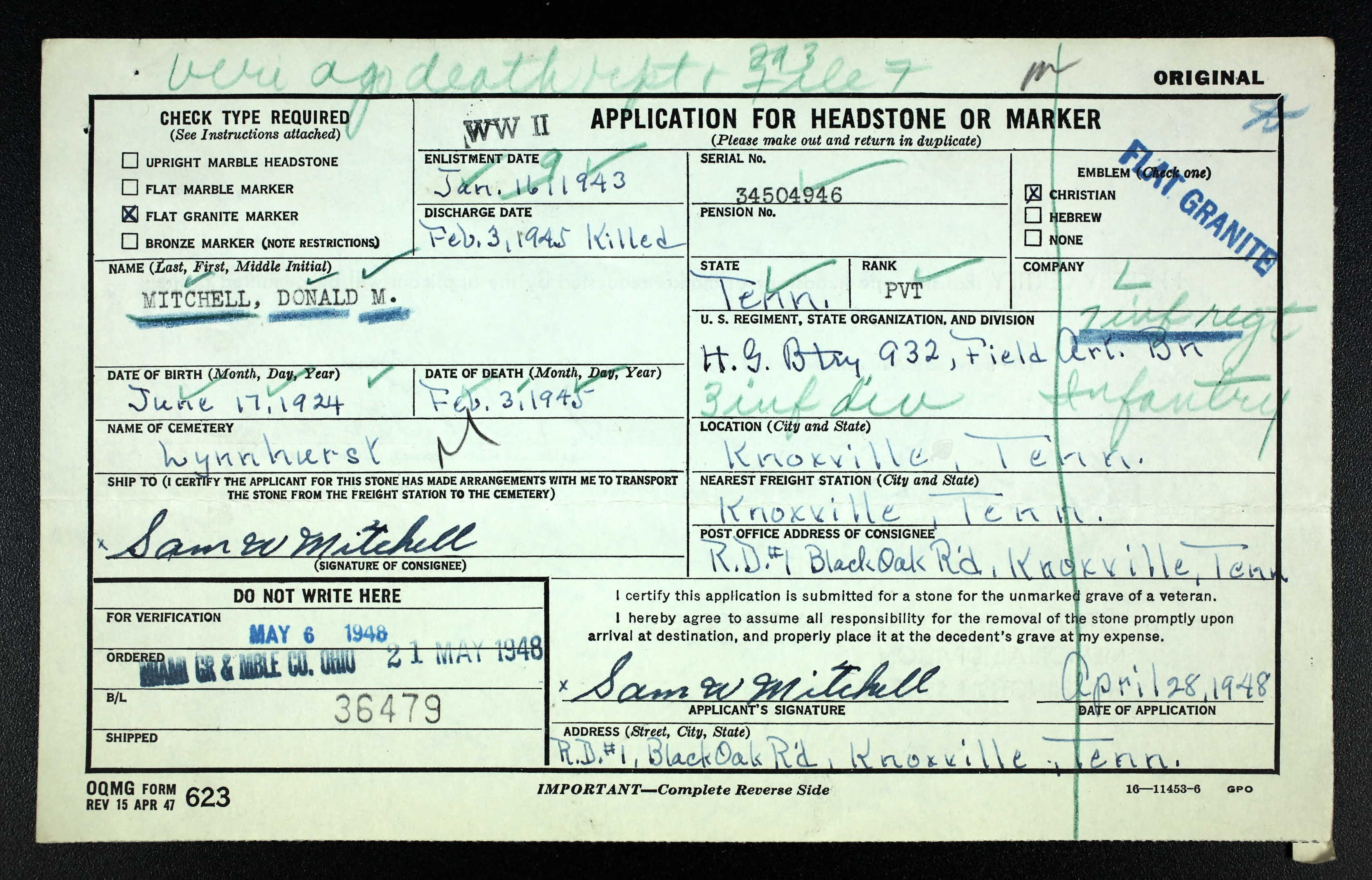 Private Mitchell enlisted on 9 January 1943 at Fort Oglethorpe, Georgia.