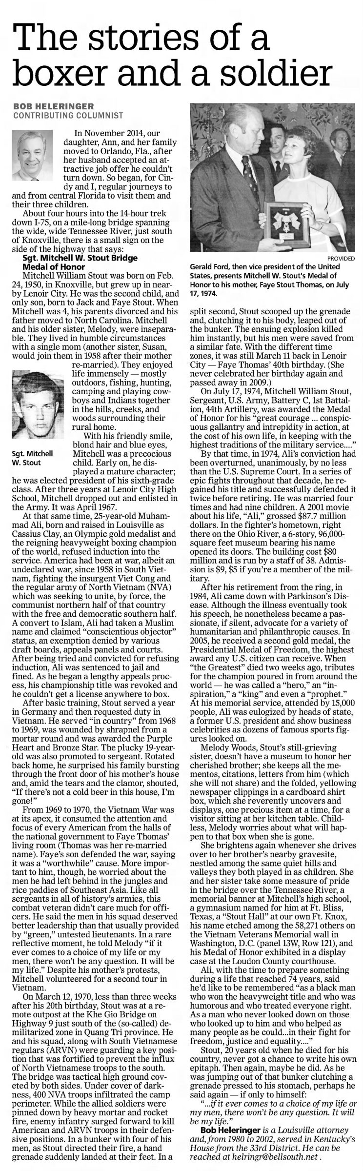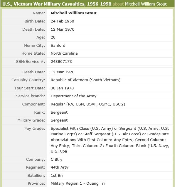 Sgt Stout distinguished himself during an attack by a North Vietnamese Army Sapper company on his unit’s firing position at Khe Gio Bridge, Sgt. Stout was in a bunker with members of a searchlight crew when the position came under heavy enemy mortar fire and ground attack. When the intensity of the mortar attack subsided, an enemy grenade was thrown into the bunker. Displaying great courage, Sgt Stout ran to the grenade, picked it up, and started out of the bunker. As he reached the door, the grenade exploded. By holding the grenade close to his body and shielding its blast, he protected his fellow soldiers in the bunker from further injury or death. Sgt. Stout’s conspicuous gallantry and intrepidity in action, at the cost of his own life, are in keeping with the highest tradition of the Military service and reflect great credit upon him, his unit and the U.S. Army.