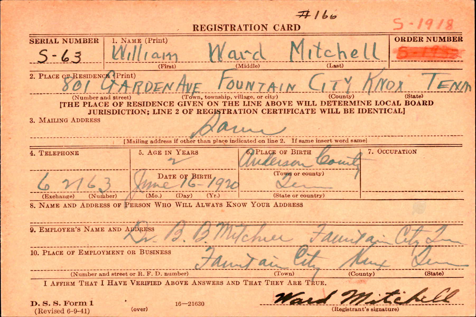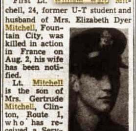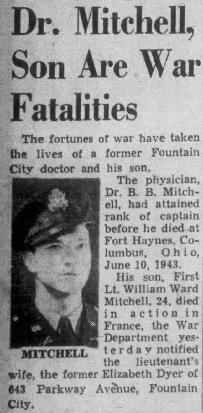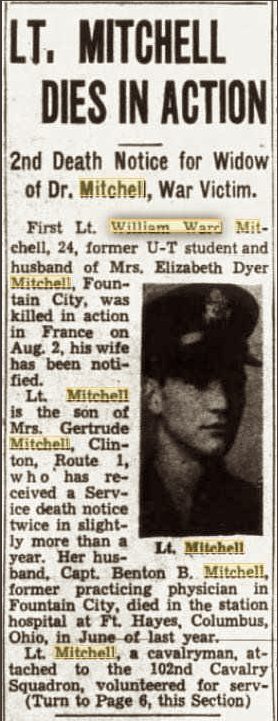 William Ward Mitchell died in action in France August 2, 1944 at the age of 24. His father Captain Benton Burkhart Mitchell died while in service in 1943.