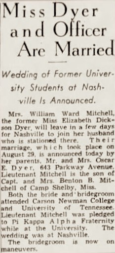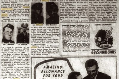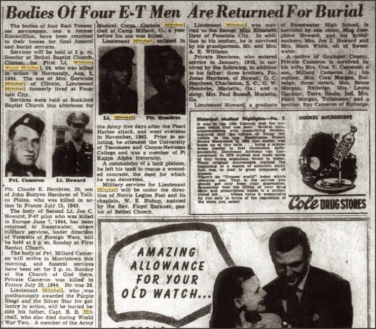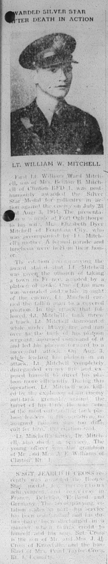 First Lt. William Ward Mitchell, son of Mrs. Benton B. Mitchell of Clinton, RFD 1, was posthumously awarded the Silver Star Medal for gallantry in action against the enemy on July 28 and August 3, 1944. The presentation was made at Fort Oglethorpe to his wife, Mrs. Elizabeth Dyer Mitchell of Fountain City, who was accompanied by Lt Michell’s mother. A formal parade and luncheon were held in their honor.