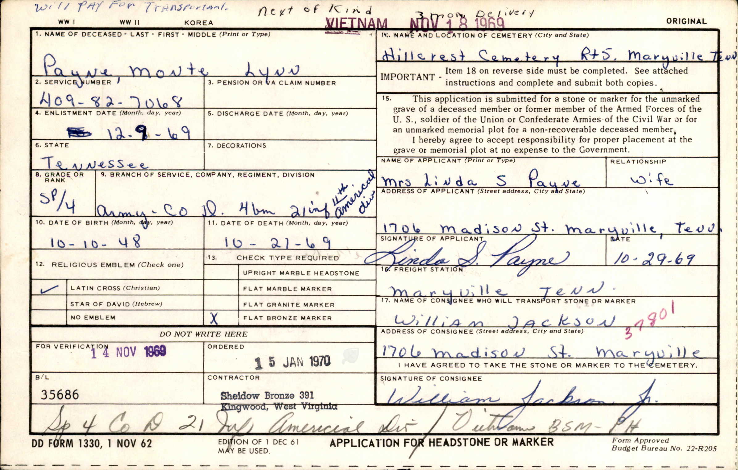 - Burial/Memorial Location: Hillcrest Cemetery, Maryville, Blount County, TN
