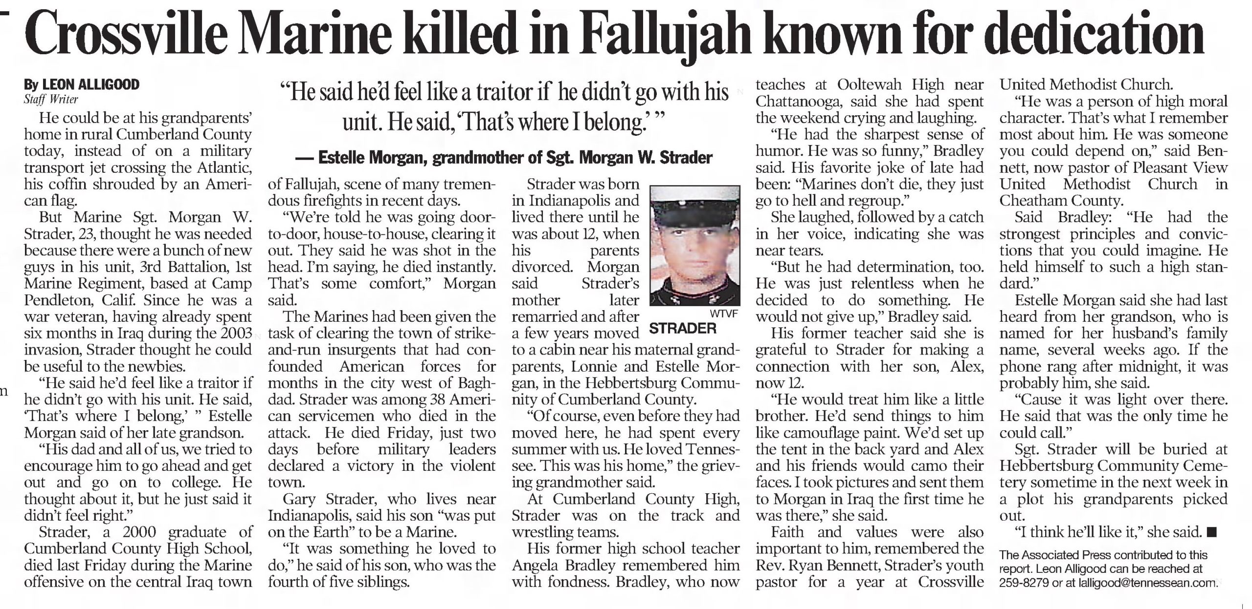 Morgan Strader joined the United States Marines in July 2000. He served with the 2nd Platoon, Kilo Company, 3rd Battalion, 1st Marine Regiment, 1st Marine Division, I Marine Expeditionary Force, Camp Pendleton, California. Sergeant Strader was serving his tour of duty in Iraq and was killed in action on November 12, 2004, while fighting in the second battle of Fallujah. He died while protecting his platoon and the convoy his platoon was escorting.