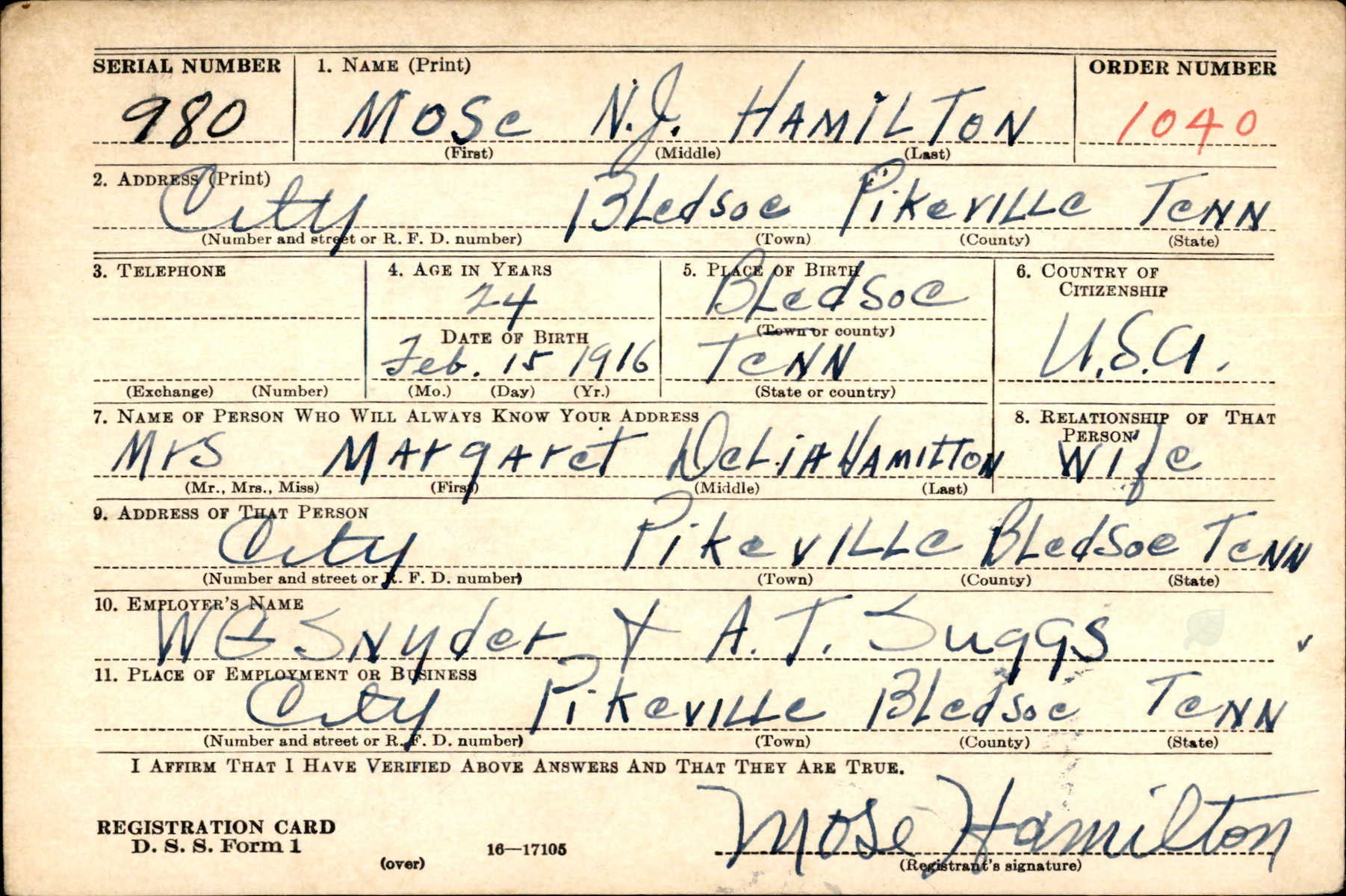 Mose N.J. Hamilton was born in Bledsoe, Tennessee, the son of Alice Maude Hamilton. Stepson of William T. Rothwell. Husband of Margaret Delia Hamilton and father of a daughter,