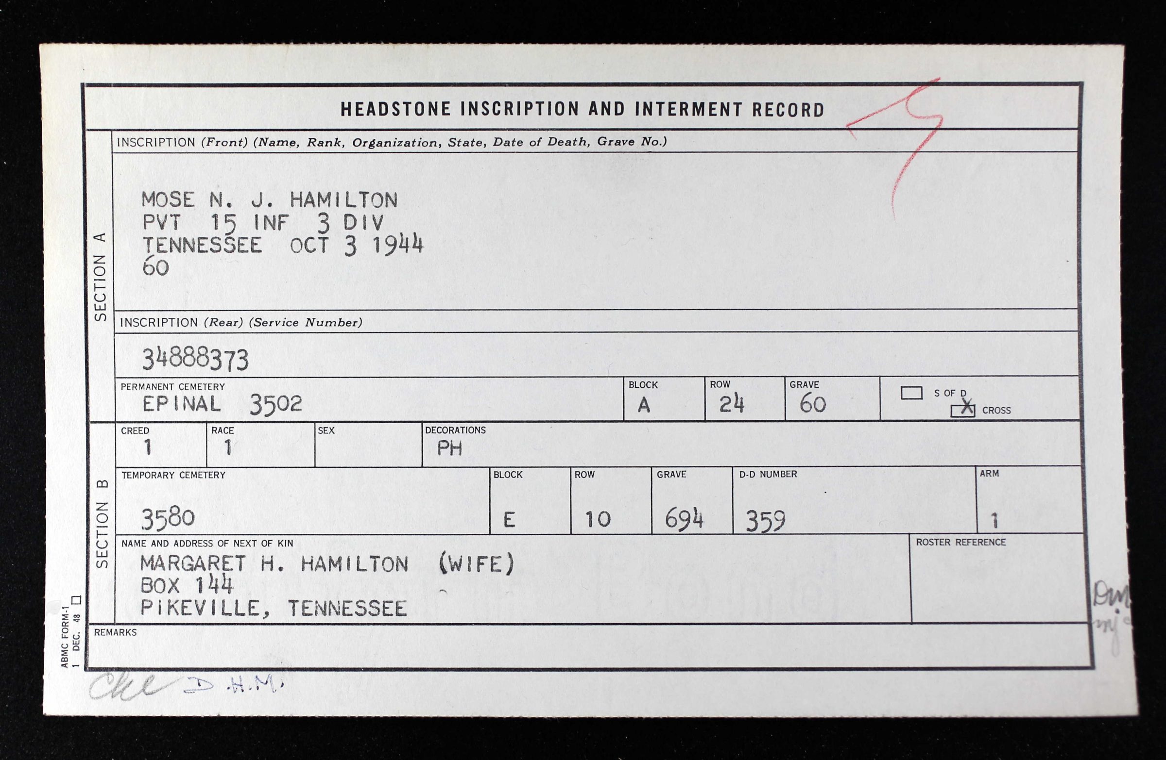 Mose Hamilton was initially buried at Saint-Jean Cemetery in Besançon, France, and re-buried at Epinal American Cemetery, Epinal (Vosges), France, A, 24, 60b