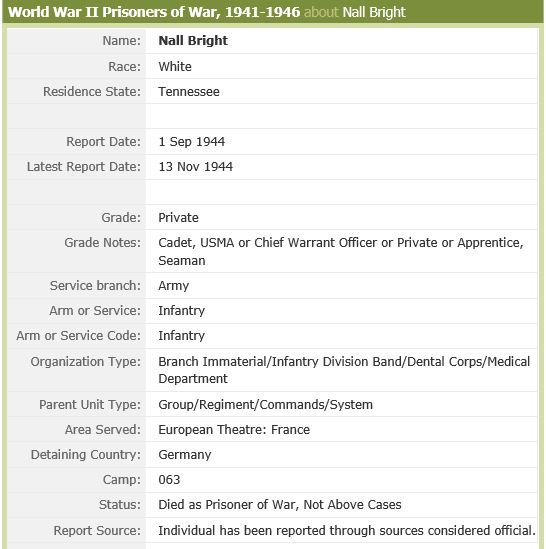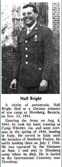Pvt Nall Bright was transported across France into Germany and was initially a resident of Stalag 12A/XIIA- a notoriously awful prison camp used to register prisoners in transit. It had little in the way of facilities, and rations were a little above starving portions. He was then transferred to Stalag 9B. Inmates at Stalag 9B were from at least 8 countries, Russia, Italy, Great Britain, Belgium, Serbia, Slovakia and the US. An unknown number of inmates perished there during the War. Pvt Bright’s record states that he was reported as deceased on 13 November, 1944. He died of complications from pneumonia.