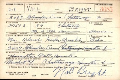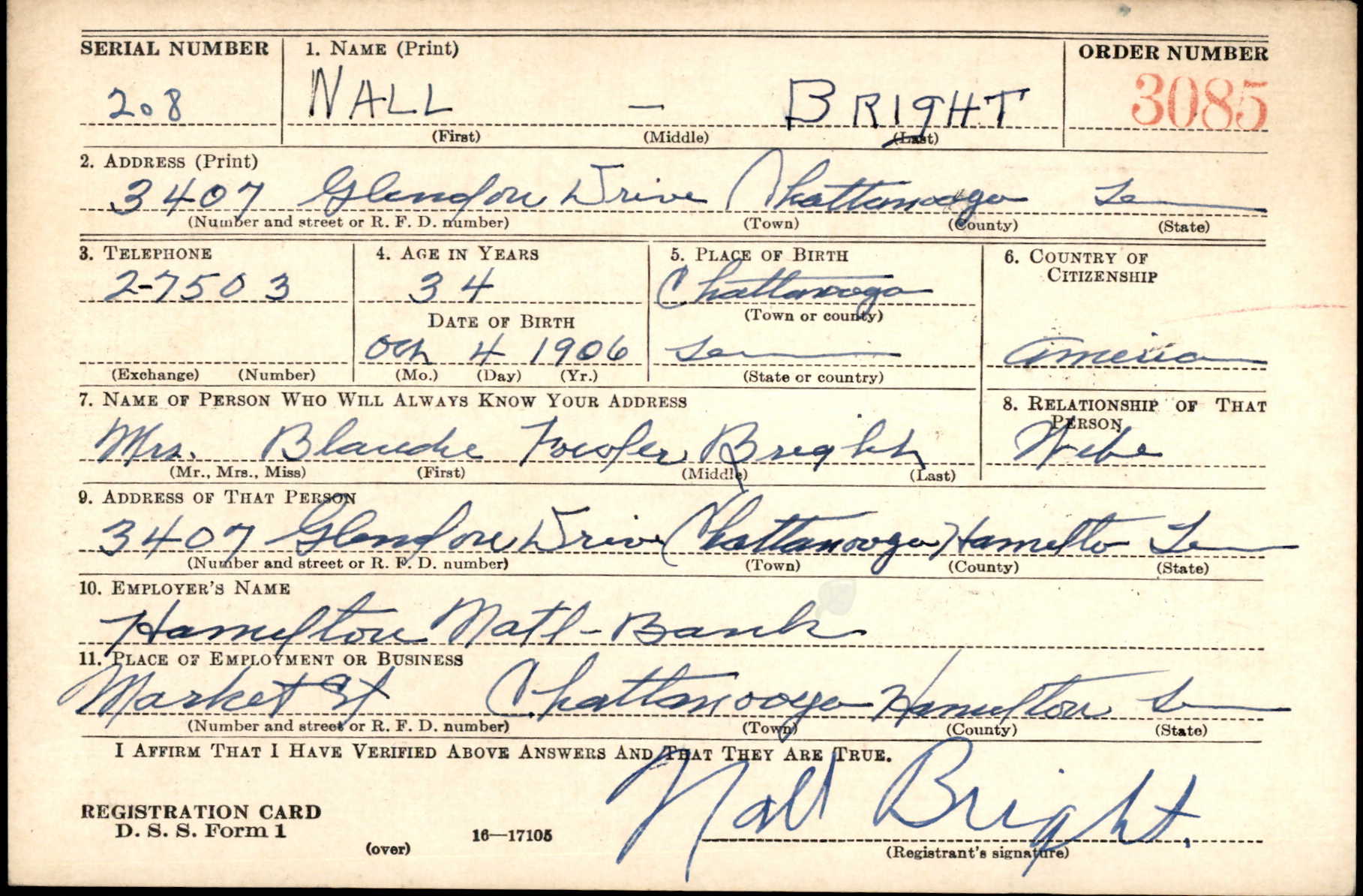 Nall Bright was married to Mrs. Mina Bright, and by 1940 they lived in Chattanooga, TN, where Nall worked as a bookkeeper. They had no children. Nall’s younger brother, John (born 25 September 1908) was an ordained Presbyterian minister and served in the US Army as a Chaplain from 1943-1946.