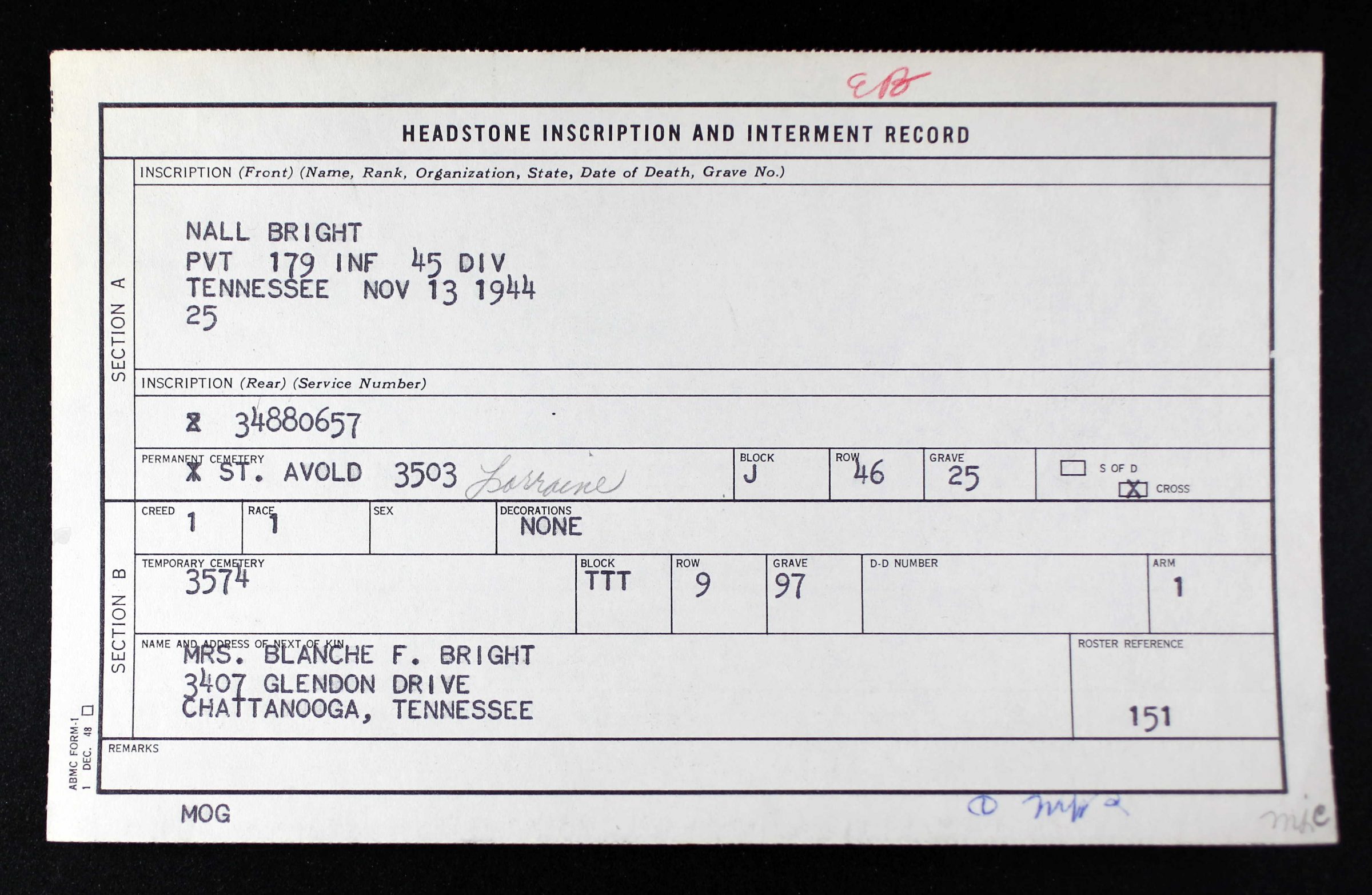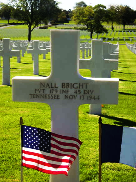 Pvt Nall Bright is buried at Lorraine American Cemetery and Memorial just outside Saint-Avold, Moselle, France; Plot J Row 46 Grave 25.