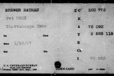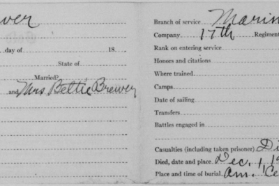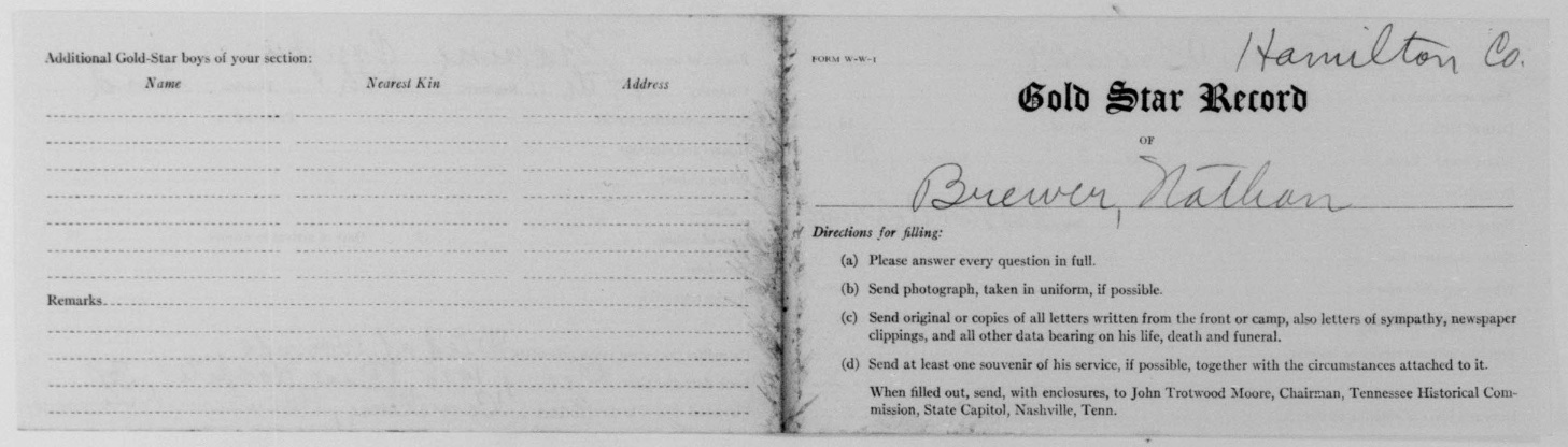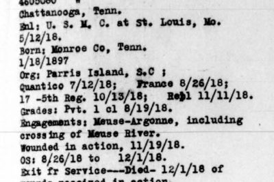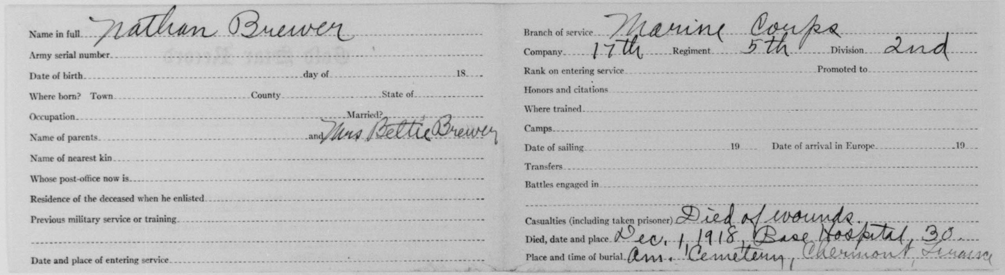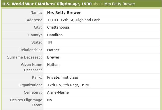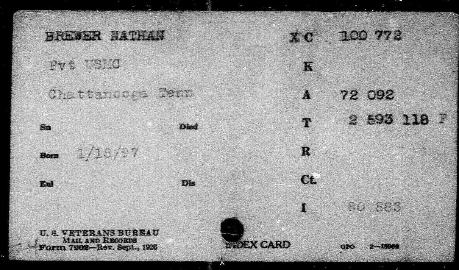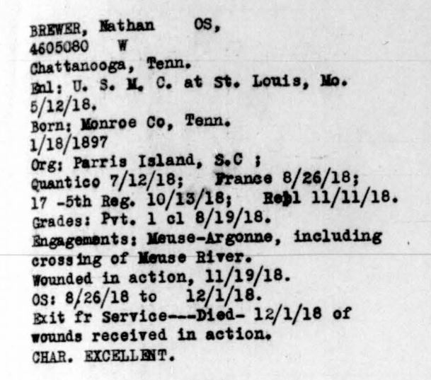 Private Nathan Brewer was born in 1897 in Monroe County, Tennessee, to parents Robert and Jane Brewer. His siblings included sisters Maude, Susan, Rose, and Ella. Brewer spent his formative years in Monroe County where his father was a farmer, prior to moving to Hamilton County in his youth. He served his country in the Marine Corps, 5th Regiment, 2nd Division, and fought in World War I. Pvt. Brewer died of wounds received in combat on December 1, 1918. He is buried in plot B, row 6, grave 20, at Aisne-Marne American Cemetery at Belleau, Lorraine Region, France.