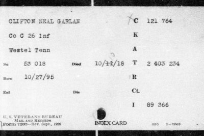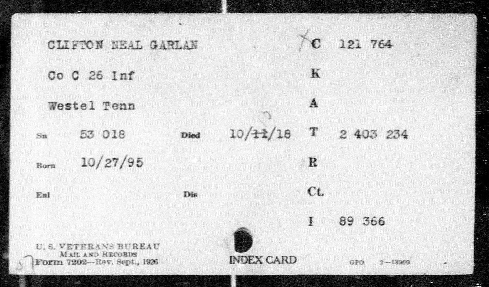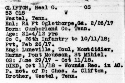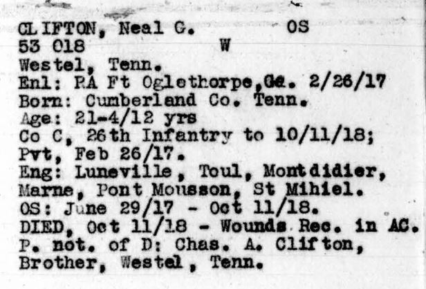 Neal Garland Clifton was born in October 1895 in Tennessee. He died of wounds received in action at the age of 21.