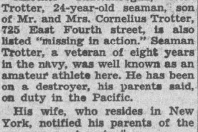 Neal Trotter, 24-year-old seaman, son of Mr. and Mrs. Cornelius Trotter, 725 East Fourth Street, is listed “missing in action.” Seaman Trotter, a veteran of eight years in the navy, was well known as an amateur athlete here. He has been on a destroyer, his parents said, on duty in the Pacific.