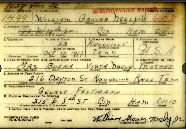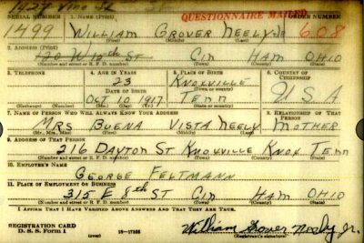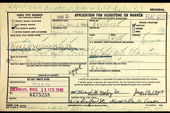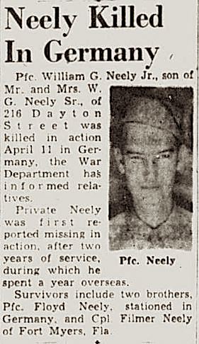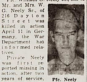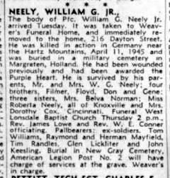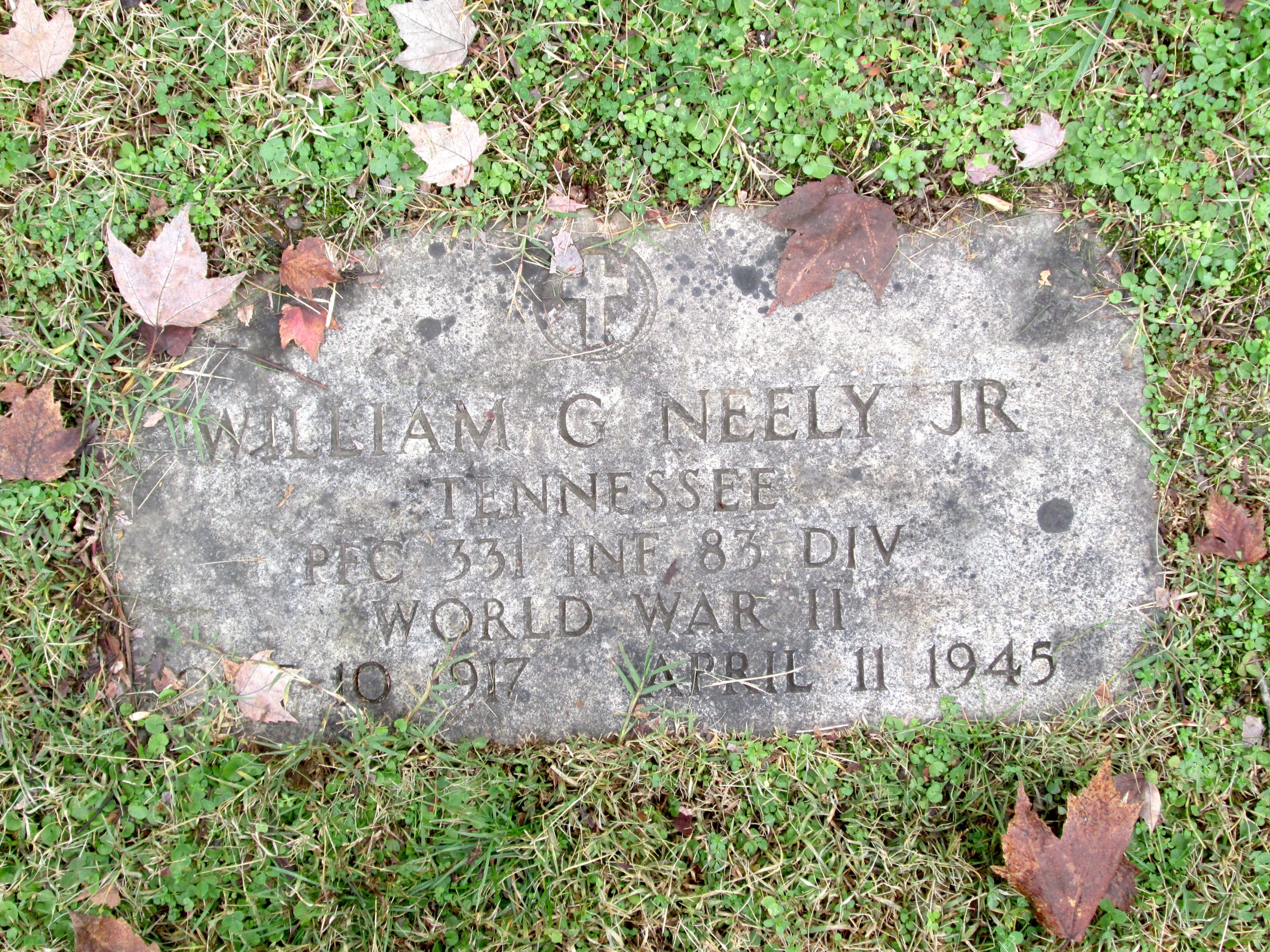 William Grover Neely Jr. was born in Knoxville, TN to William Grover Neely and Buena Vista Amanns. He was wounded in action in France, July 26 and killed in action April 11, 1945 in Germany. He was first reported missing in action, after two years of service, during which he spent a year overseas.