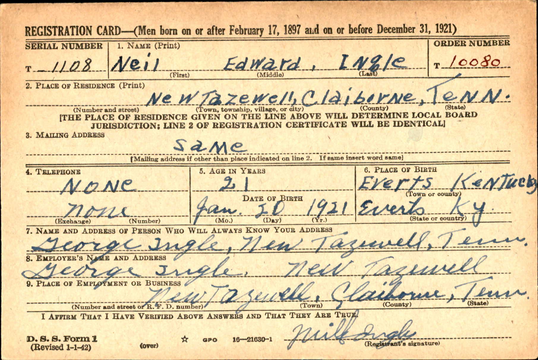 Neil Edward Ingle was born on 20 January 1922, Bell County, Kentucky to George Washington Ingle and Mossie Etta Noah.