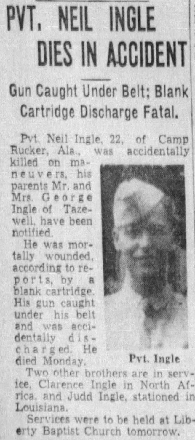 Pvt. Neil Ingle, 22, of Camp Rucker, Ala., was accidentally killed on maneuvers, his parents, Mr. and Mrs. George Ingle of Tazewell, have been notified. He was mortally wounded, according to reports, by a blank cartridge. His gun caught under his belt and was accidentally discharged. He died Monday. Two other brothers are in service, Clarence Ingle in North Africa and Judd Ingle, stationed in Louisiana. Services were to be held at Liberty Baptist Church.