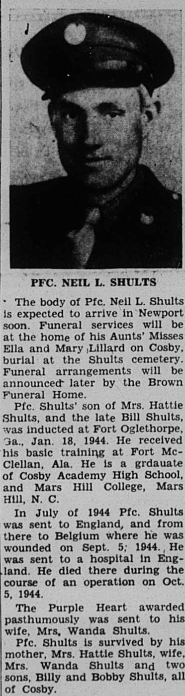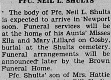 The body of Pfc. Neil L. Shults is expected to arrive in Newport soon. Funeral services will be at the home of his Aunt’s Misses Ella and Mary Lillard on Cosby, burial at the Shults cemetery.