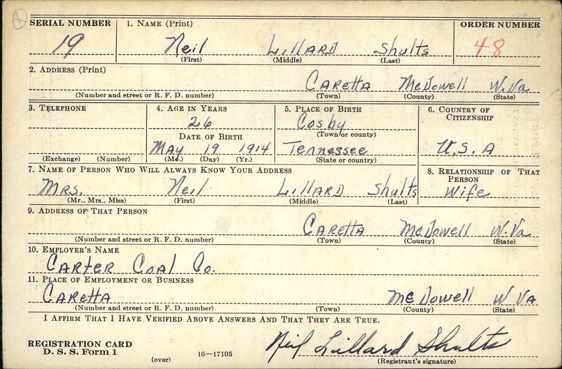 Neil Lillard Shults was born on 19 May 1914 in Cosby, Cocke County, Tennessee. Son of William and Hattie Lillard Shults. Husband of Wanda Shults.
