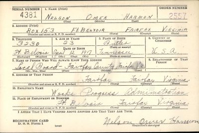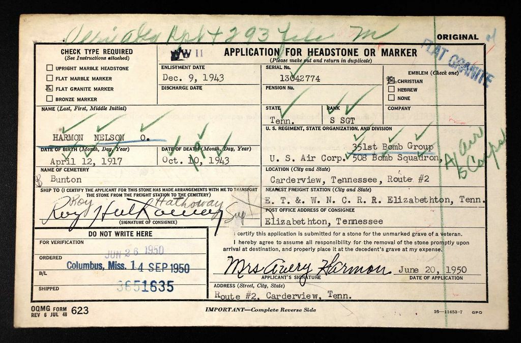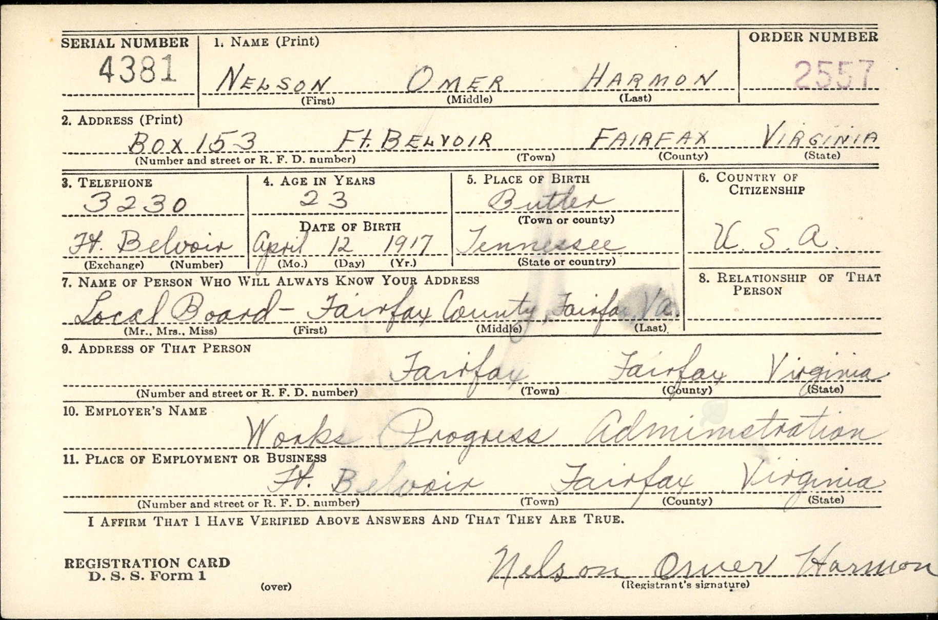 Nelson Omer Harmon was born on 12 April 1917 to Avery Martin Harmon and Anna Mae Bunton.