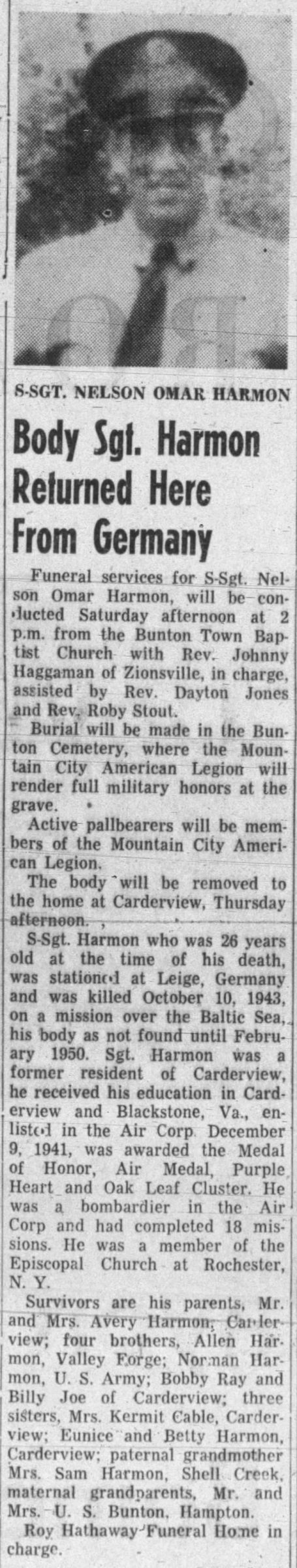 The body of Staff Sergeant Nelson Omar Harmon of the Butler section, who was killed in action over the Baltic Sea on Oct. 10, 1943, has been returned for burial. Funeral has been set for 2 o’clock Saturday, June 17, at Buntontown Baptist Church, with Rev. John Hagaman of Zionville, N.C., Rev. Dayton Jones and Rev. J. Roby Stout officiating. Burial will be in Bunton Cemetery with military honors accorded by the local color guard and firing squad.