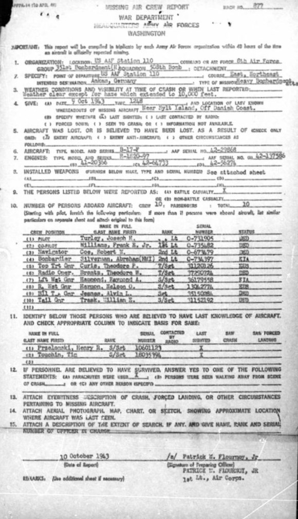 Aircraft B-17F with serial number 42-29868 was on a heavy bombardment mission to Ankam, Germany. The aircraft was hit by an ME-109 over the Baltic Sea. The ship caught fire immediately and exploded in the air. The Top Turret Gunner, Navigator, Bombardier and Co-pilot bailed out. A German boat picked up Curlis an hour later. He encouraged the Germans to search for the others. Williams was next to be picked up and the third fellow was Teal, T/Sgt (not a crewmember of aircraft 42-29868). The Germans didn´t give up their search immediately but continued for some time. Though no others were picked up. The body of Silverman washed ashore on 10 October 1943 at Fodslette, on the island of Langeland, Demark. Staff Sergeant Harmon’s body also washed ashore and was recovered by the German customs guards and initially buried at Petersdorf Cemetery, Petersdorf, Germany. He was later repatriated to the U.S. and was interred at Bunton Cemetery, Johnson County, TN in 1950.