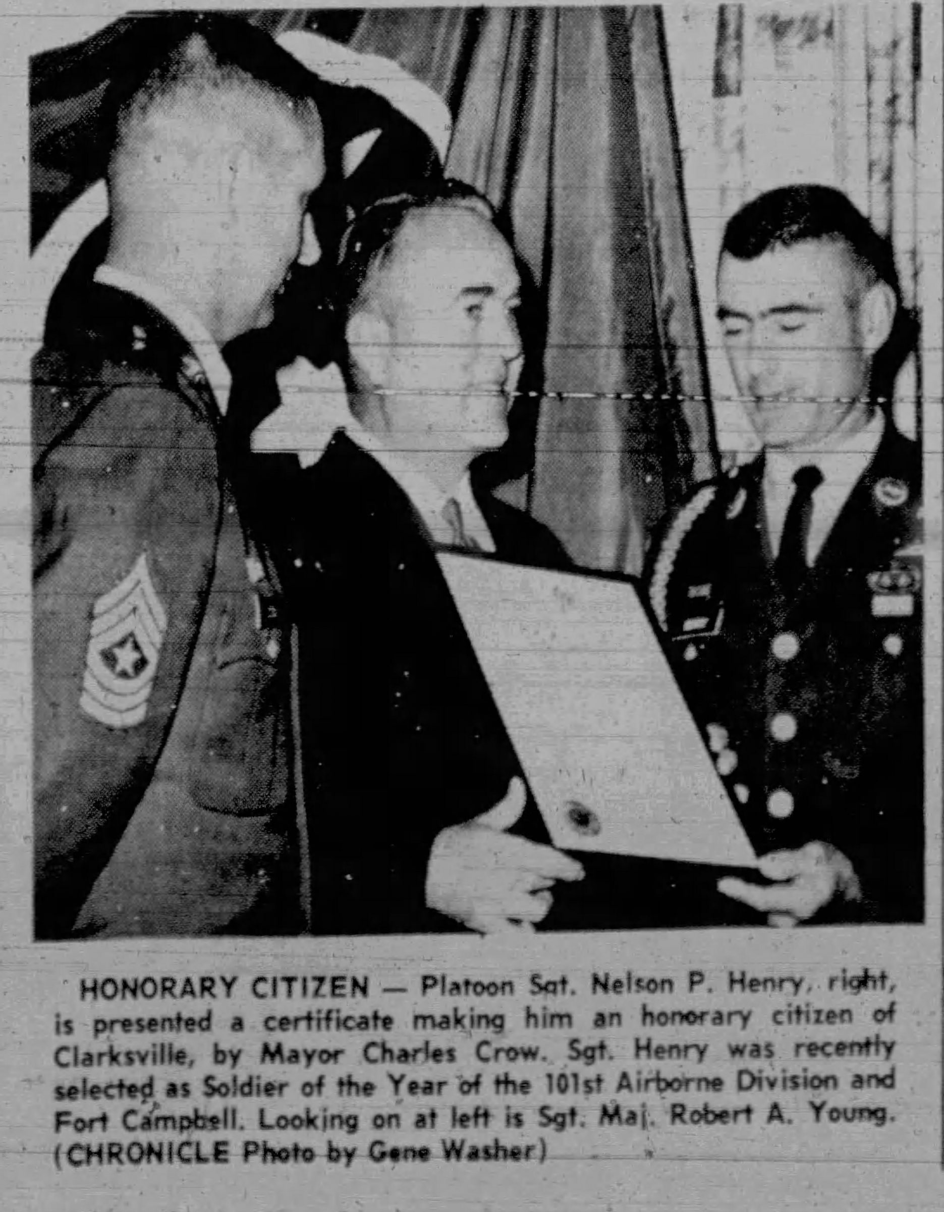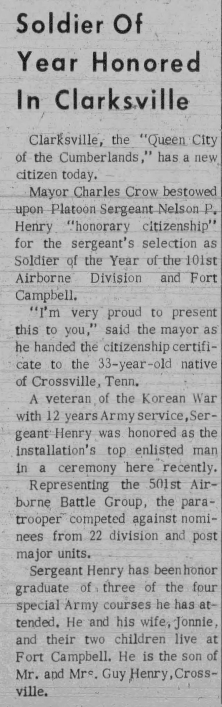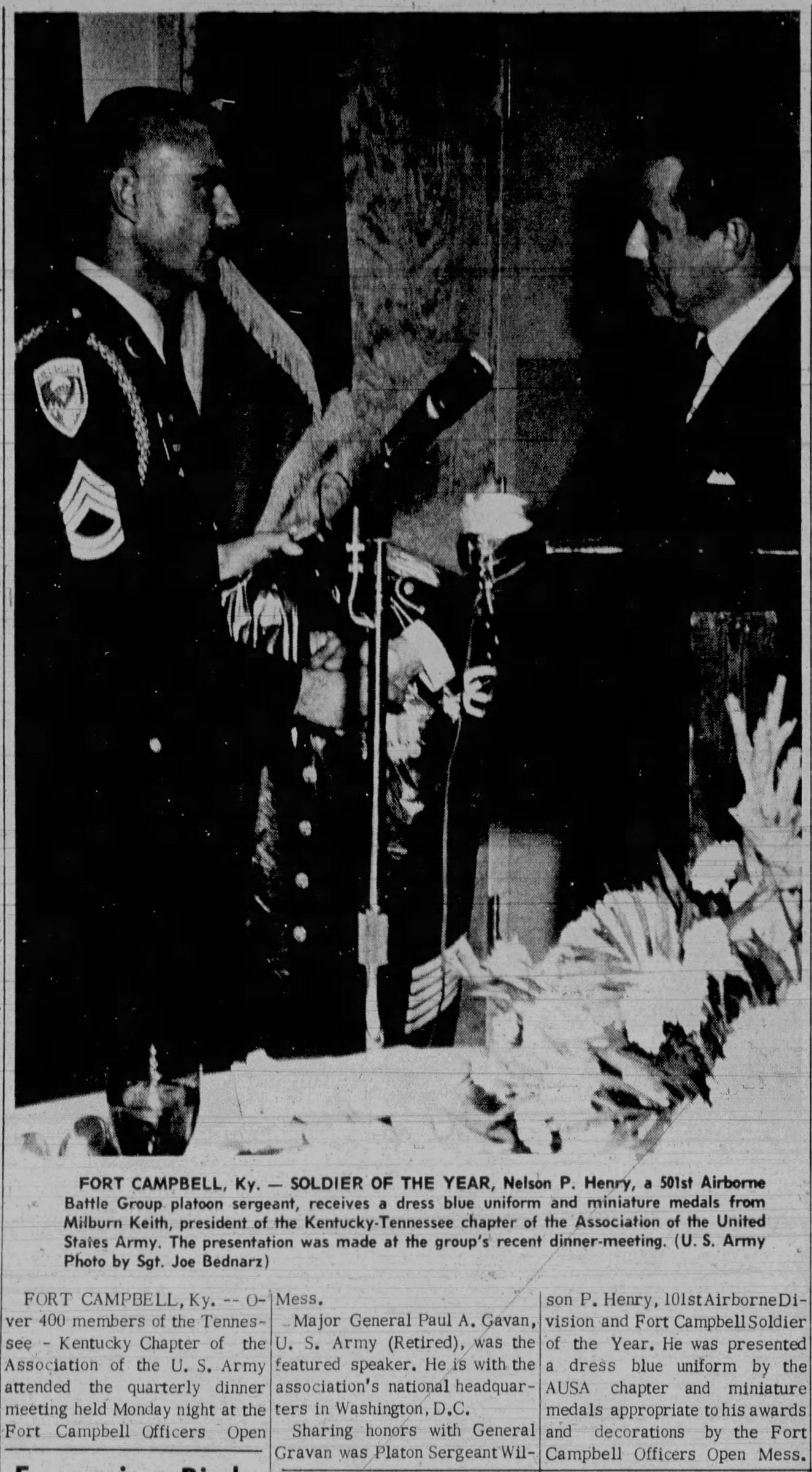 I served with the 501st Infantry, 101st Airborne Div at Fort Campbell between 1962-1965. I knew PSgt Nelson for a while. He was an outstanding airborne soldier. He made Division Soldier of the Year in 1963, presented by Maj Gen Critz on 24 October 1963. I just wanted to say he’s remembered well and let his family and friends know that he was an outstanding paratrooper.