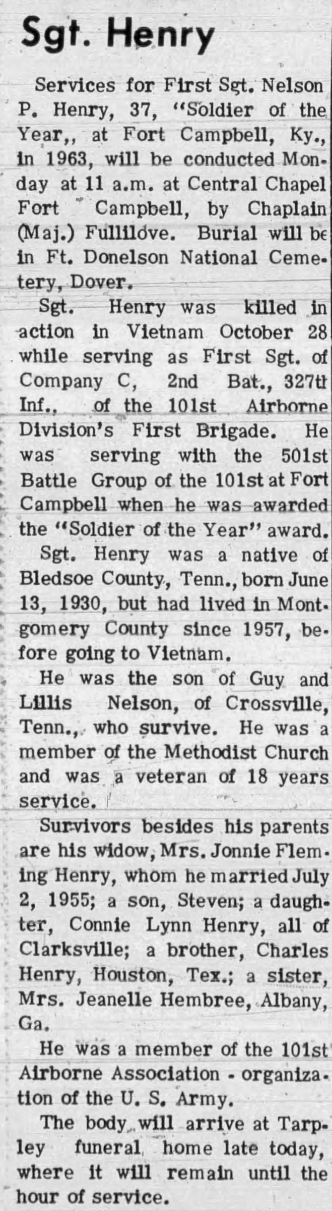 First Sergeant Nelson Page Henry was born on June 13, 1930, and was originally from Crossville, Tennessee. He served his country in the Vietnam War in the United States Army, as an infantry senior sergeant (parachutist) in C Company, 2nd Battalion, 327th Infantry, 101st Airborne Division. He was an 18-year veteran of the Army when his tour in Vietnam began on May 1, 1967. Later that year, on October 28, 1967, FSgt. Henry was killed while under hostile conditions in Quang Tin province, South Vietnam, at the age of 37. He was a recipient of the Purple Heart medal. FSgt. Henry was survived by his wife, Johnnie Ruth Fleming Henry. He is buried at Fort Donelson National Cemetery in Dover, Stewart County, Tennessee, and is memorialized on the Vietnam Veterans Memorial on Panel 28E, Line 91.