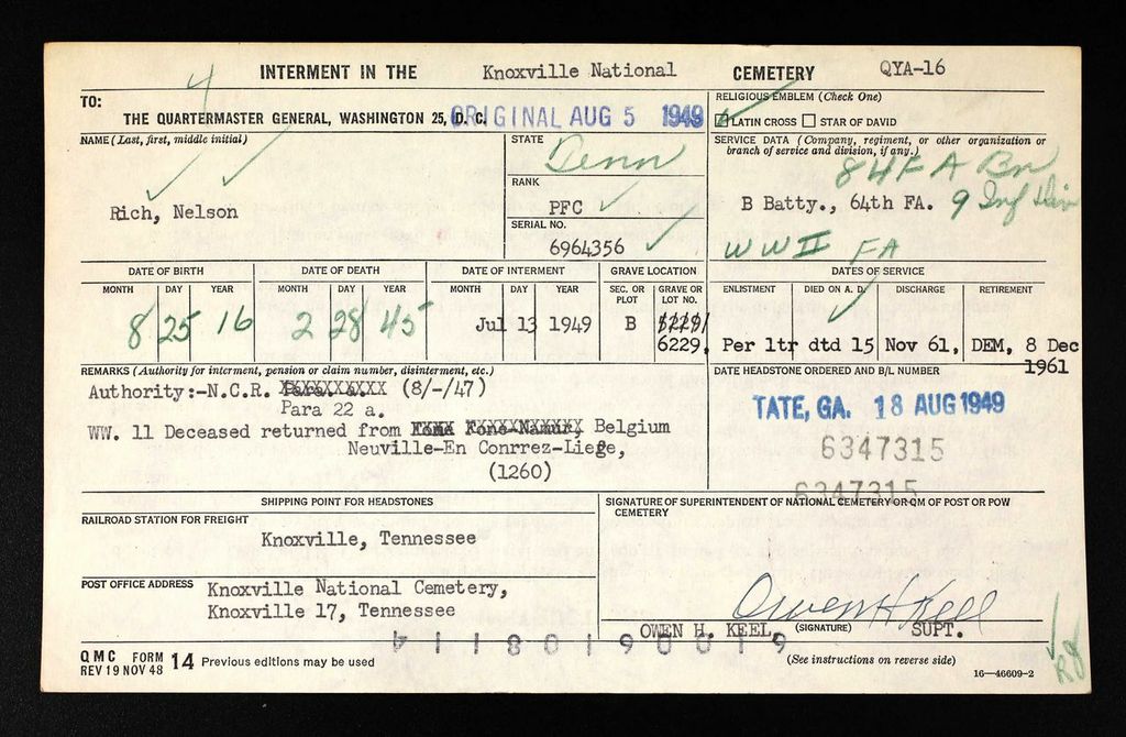 PFC Rich was initially buried at the American War Cemetery, Neuville-en-Condroz, Belgium. Buried at Knoxville National Cemetery, B, 6229.