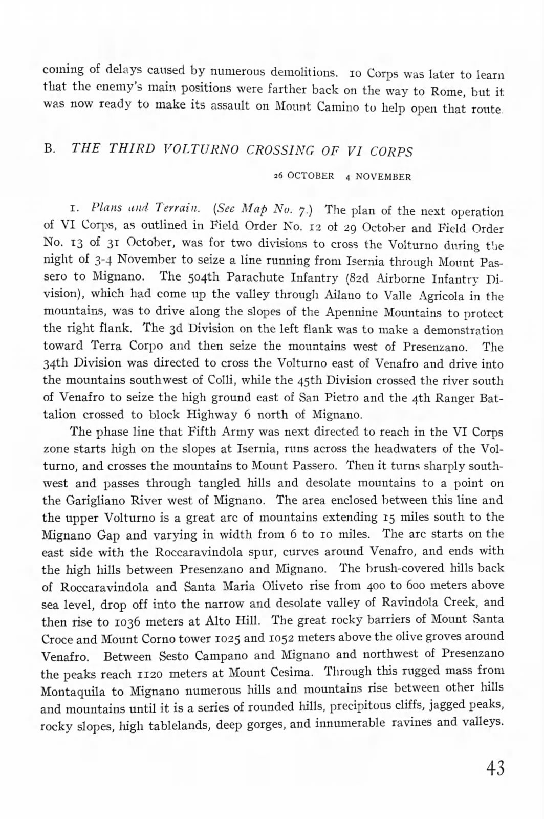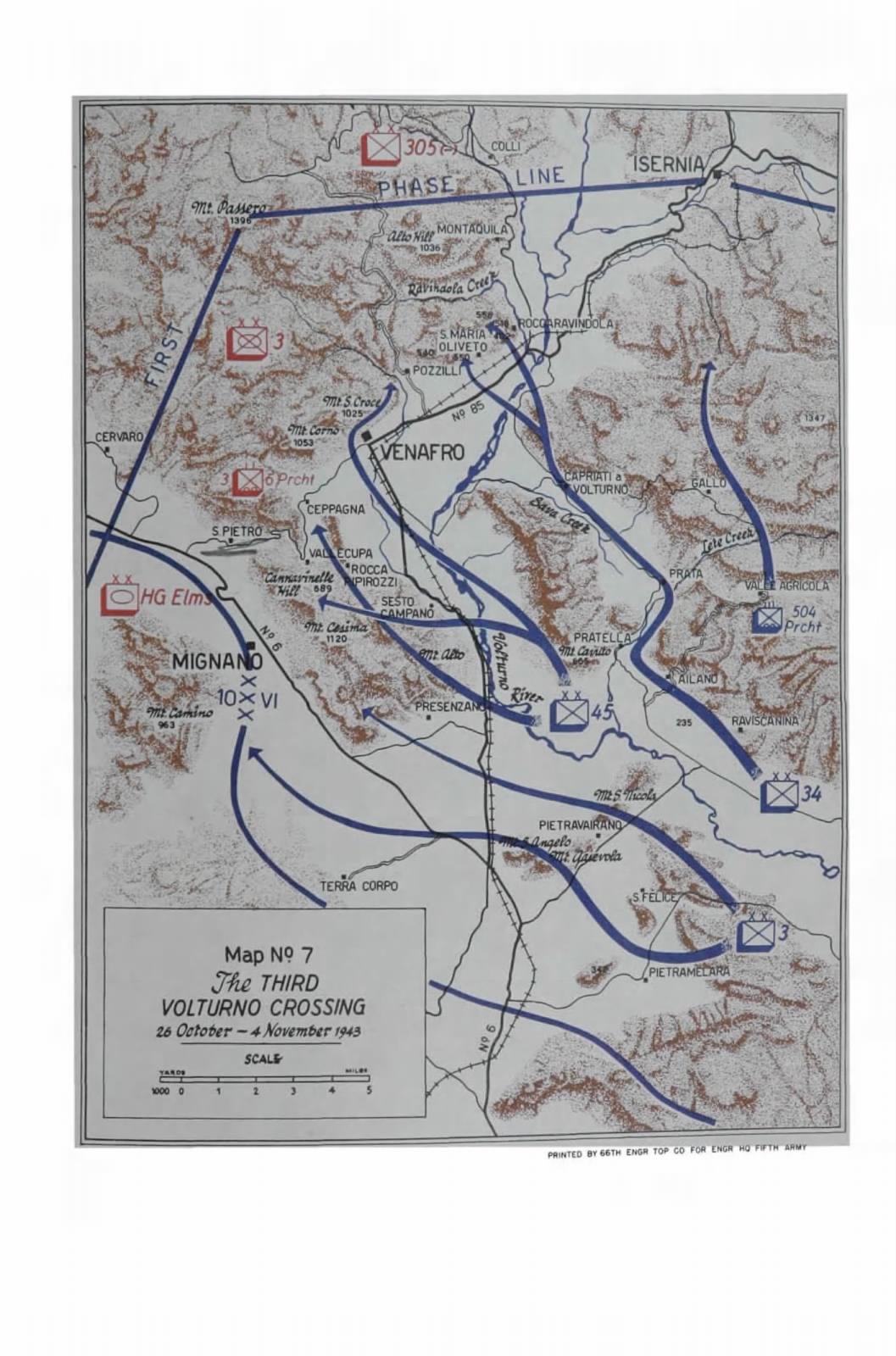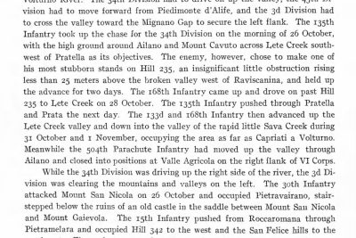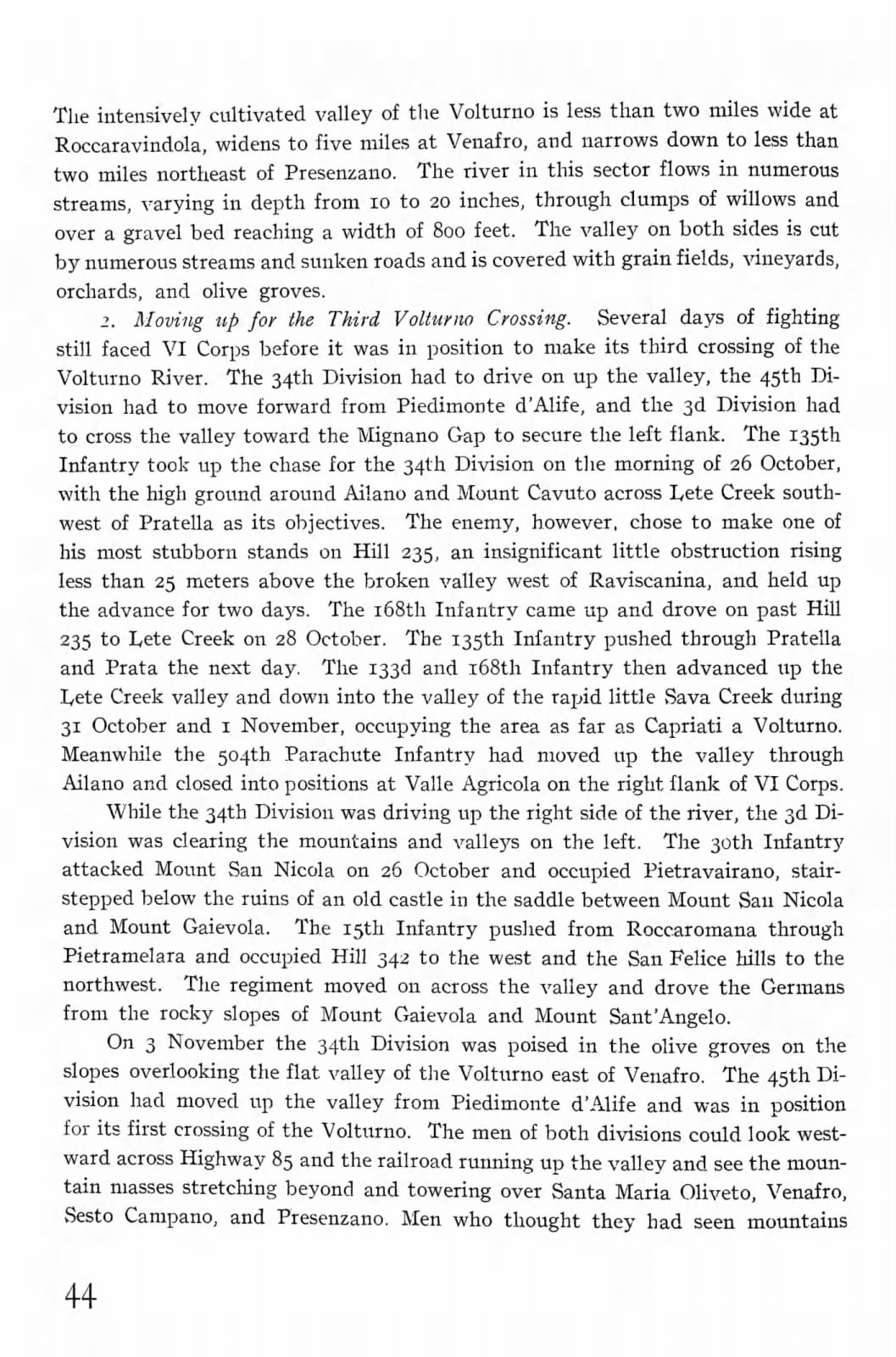 Several days of fighting still faced VI Corps before it was in position to make its third crossing of the Volturno River. The 34th Division had to drive on up the valley, the 45th Division had to move forward from Piedimonte d’Alife, and the 3rd Division had to cross the valley toward the Mignanon Gap to secure the left flank. The 135th Infantry took up the chase for the 34th Division on the morning of 26 October, with the high ground around Ailano and Mount Cavuto across Lete Creek southwest of Pratella as its objectives. The enemy, however, chose to make one of his most stubborn stands on Hill 235, a insignificant little obstruction rising less than 25 meters above the broken valley west of Raviscanina, and held up the advance for two days. The 168th Infantry camp up and drove on past Hill 235 to Lete Creek on 28 October. The 135th Infantry pushed through Pratella and Prata the next day.