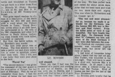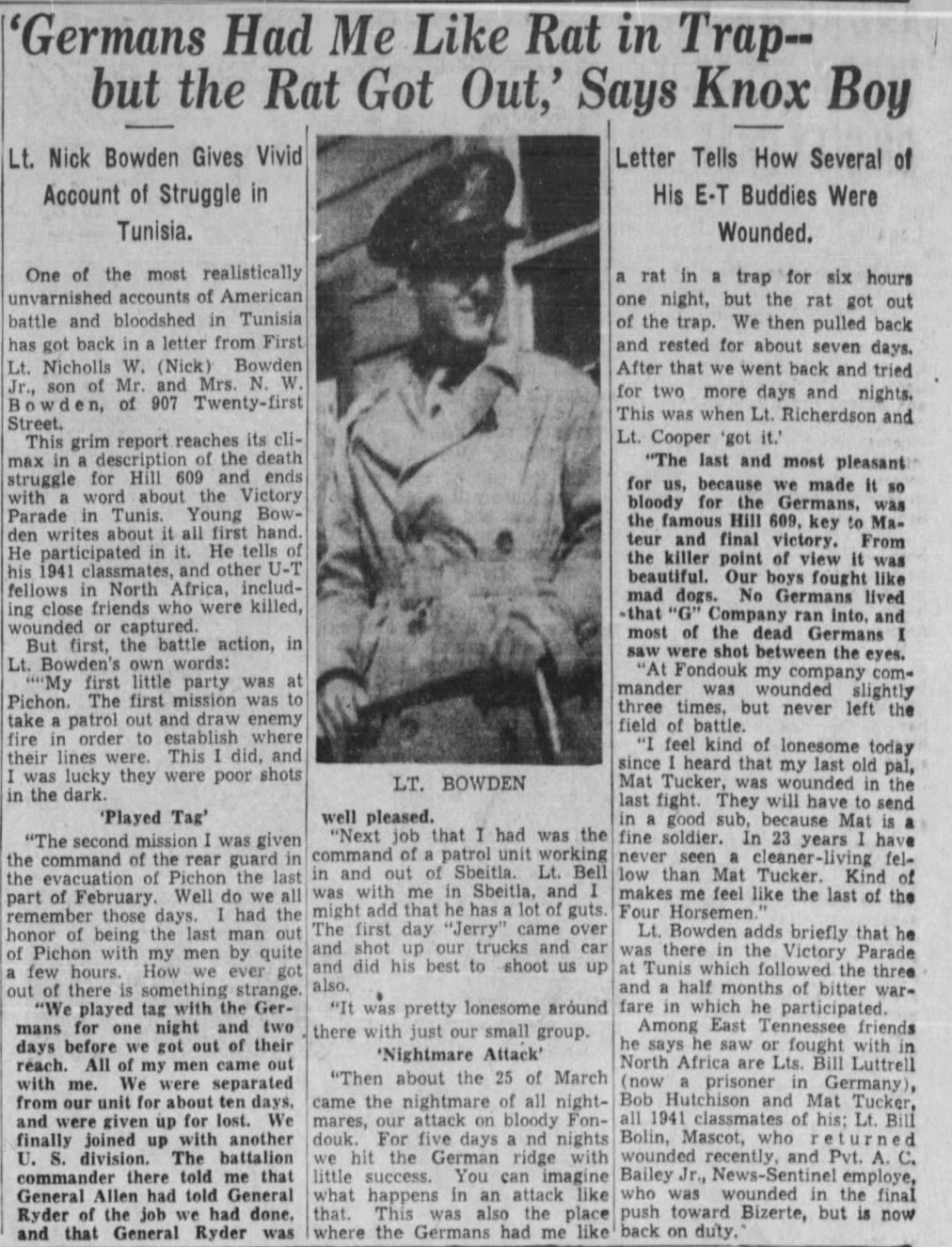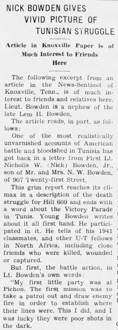 The following excerpt from an article in the News-Sentinel of Knoxville, Tenn., is of much interest to friends and relatives here. Lieut. Bowden is a nephew of the late Lem H. Bowden. The article reads, in part, as follows: One of the most realistically unvarnished accounts of American battle and bloodshed in Tunisia has got back in a letter from First Lt. Nicholls W. (Nick) Bowden, Jr., son of Mr. and Mrs. N.W. Bowden, of 907 Twenty-first Street.