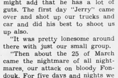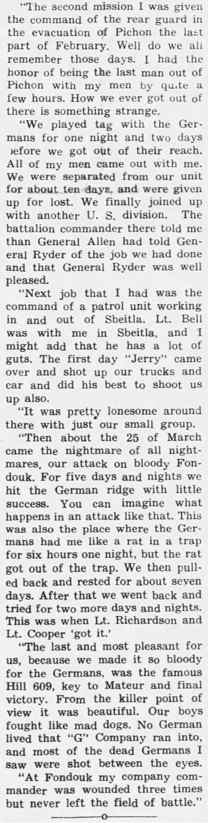 “My first little party was at Pichon. The first mission was to take a patrol out and draw enemy fire in order to establish where their lines were. This I did, and I was lucky they were poor shots in the dark. The second mission I was given the command of the rear guard in the evacuation of Pichon the last part of February. Well do we all remember those days. I had the honor of being the last man out of Pichon with my men by quite a few hours. How we ever got out of there is something strange. We played tag with the Germans for one night and two days before we got out of their reach. All of my men came out with me. We were separated from our unit for about ten days, and were given up for lost. We finally joined up with another U.S. Division. The battalion commander there told me than General Allen had told General Ryder of the job we had done and that General Ryder was well pleased. Next job that I had was the command of a patrol unit working in and out of Sbeitla. Lt. Bell was with me at Sbeitla, and I might add that he has a lot of guts. The first day “Jerry” came over and shot up our trucks and car and did his best to shoot us up also. It was pretty lonesome around there with just our small group. Then about the 25 of March came the nightmare of all nightmares, our attack on bloody Fondouk. For five days and nights we hit the German ridge with little success. You can imagine what happens in an attack like that. This was also the place where the Germans had me like a rat in a trap for six hours one night, but the rat got out of the trap. We then pulled back and rested for about seven days. After that we went back and tried for two more days and nights. This was when Lt. Richardson and Lt. Cooper ‘got it.’
