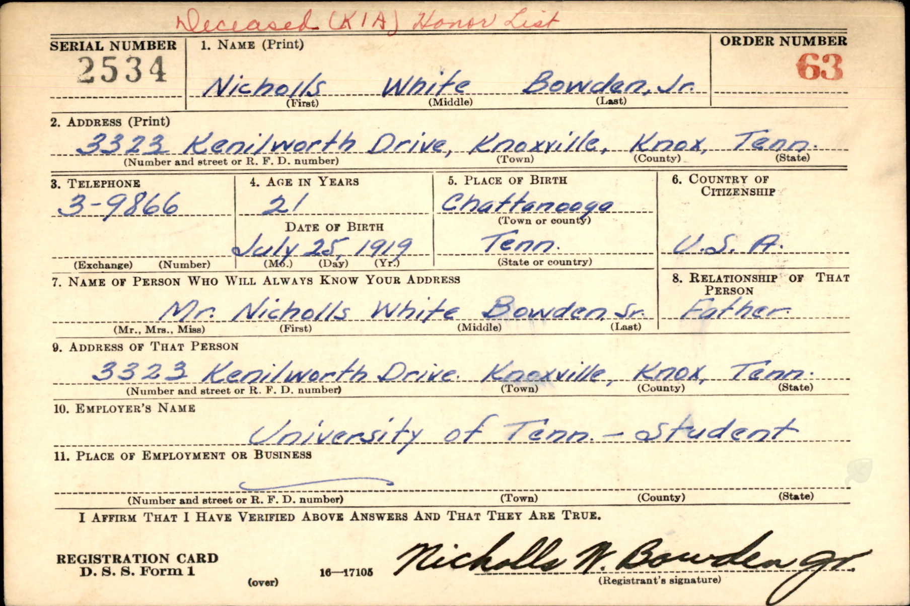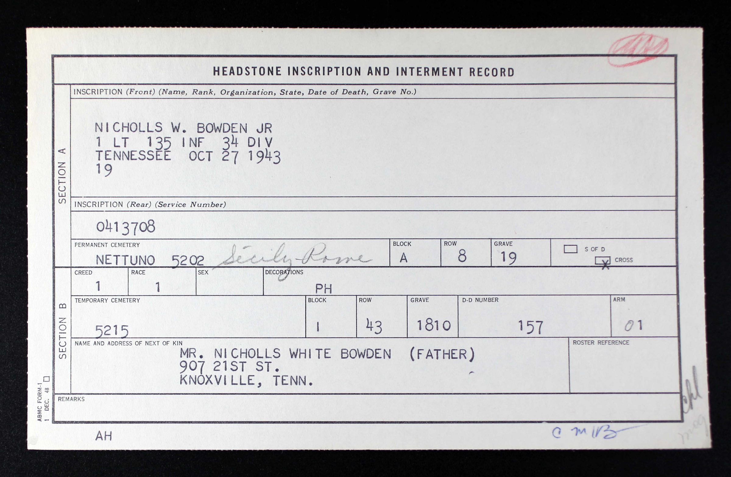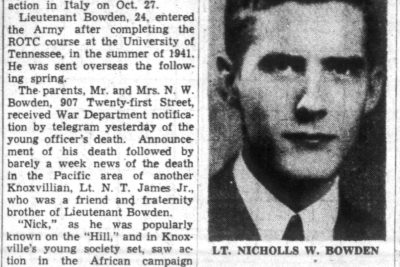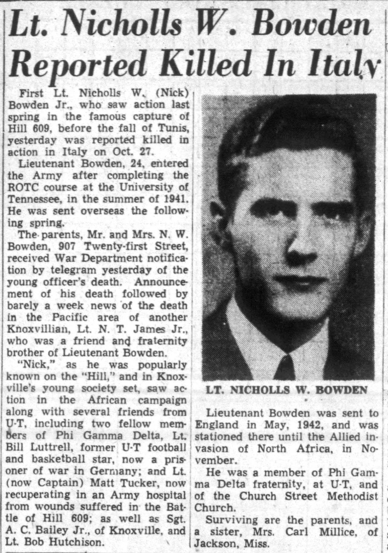 First Lt. Nicholls W. (Nick) Bowden Jr., who saw action last spring in the famous capture of Hill 609, before the fall of Tunis, yesterday was reported killed in action in Italy on Oct. 27. Lieutenant Bowden, 24, entered the Army after completing the ROTC course at the University of Tennessee, in the summer of 1941. He was sent overseas the following spring. The parents, Mr. and Mrs. N.W. Bowden, 907 Twenty-first street, received War Department notification by telegram yesterday of the young officer’s death. Announcement of his death followed by barely a week news of the death in the Pacific area of the another Knoxvillian, Lt. N.T. James Jr., who was a friend and fraternity brother of Lieutenant Bowden. “Nick”, as he was popularly known on the “Hill,”and in Knoxville’s young society set, saw action in the African campaign along with several friends from U-T, including two fellow members of Phil Gamma Delta, Lt. Bill Luttrell, former U-T football and basketball star, now a prisoner of war in Germany; and Lt. (now Captain) Matt Tucker, now recuperating in an Army hospital from wounds suffered in the Battle of Hill 609; as well as Sgt. A.C. Bailey Jr., of Knoxville,, and Lt. Bob Hutchinson. Lieutenant Bowden was sent to England in May, 1942, and was stationed there until the Allied invasion of North Africa in November. He was a member of Phi Gamma Delta fraternity, at U-T, and of the Church Street Methodist Church. Surviving are the parents, and a sister, Mrs. Carl Millice, of Jackson, Miss.