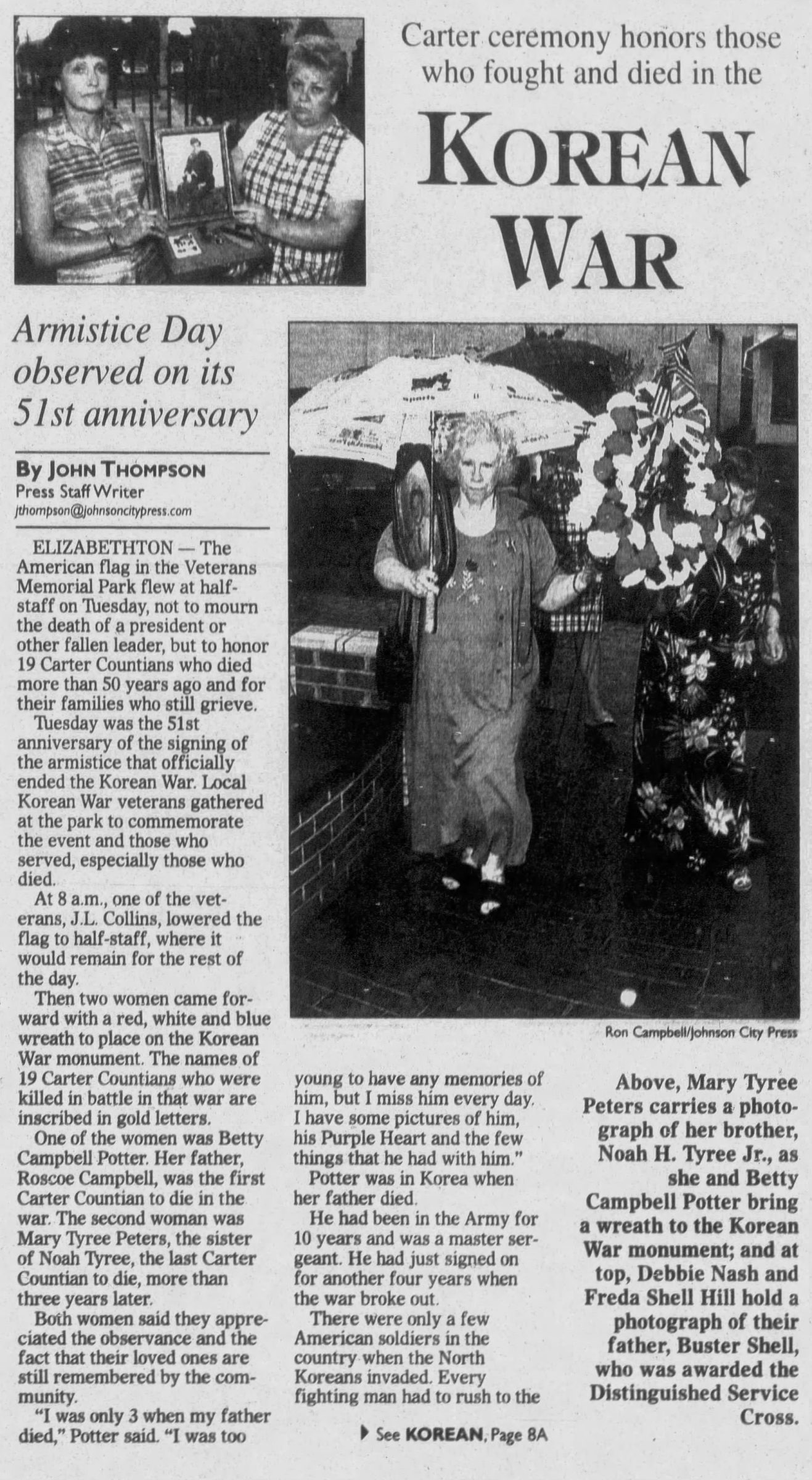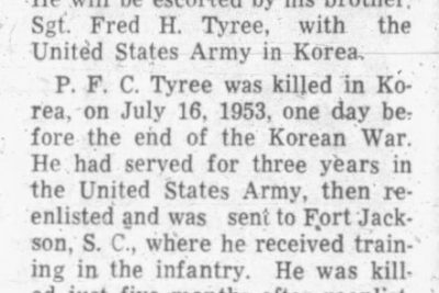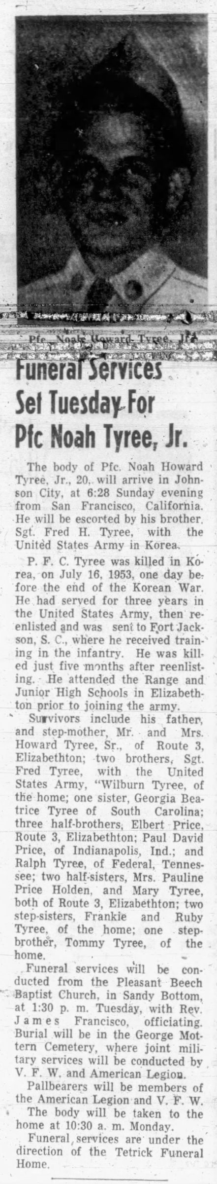 The body of Pfc. Noah Howard Tyree, Jr., 20, will arrive in Johnson City from San Francisco, California. He will be escorted by his brother, Sgt. Fred H. Tyree, witht he United States Army in Korea. P.F.C. Tyree was killed in Korea, on July 16, 1953, one day before the end of the Korean War. He had served for three years in the United States Army, the reenlisted and was sent to Fort Jackson, S.C., where he received training in the infantry. He was killed just five months after reenlistment. He attended the Range and Junior High Schools in Elizabethton prior to joining the Army.