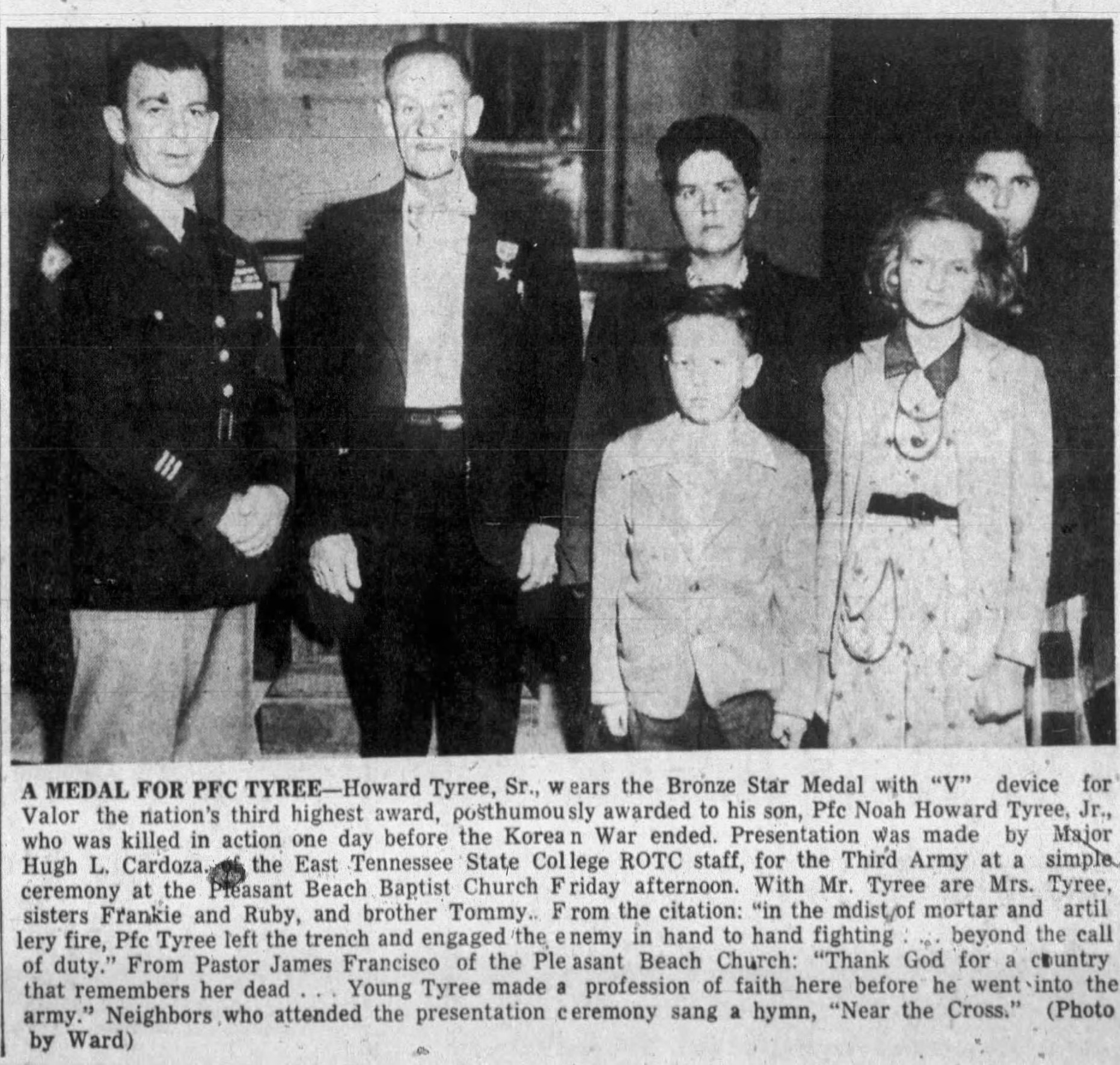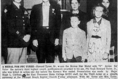 A medal for PFC Tyree – Howard Tyree Sr., wears the Bronze Star Medal with “V”device for Valor the nation’s third highest award, posthumously awarded to his son, Pfc. Noah Howard Tyree, Jr., who was killed in action one day before the Korean War ended. Presentation was made by Major Hugh L. Cardoza, of the East Tennessee State College ROTC staff, for the Third Army at a simple ceremony at the Pleasant Beach Baptist Church. With Mr. Tyree and Mrs. Tyree, sisters Frankie and Ruby, and brother Tommy. From the citation: “in the midst of mortar and artillery fire, Pfc. Tyree left the trench and engaged the enemy in hand to hand fighting … beyond the call of duty.”