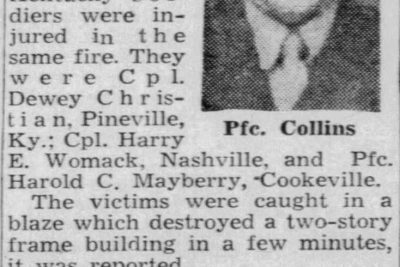 Pfc. Noah V. Collins, son of Mr. and Mrs. Sam Collins, 208 West Baxter Avenue, was one of the nine soldiers killed in a fire Dec. 23, in a medical battalion barrack on the island of Shikoku, Japan, the War Department said today. Three other Tennessee and Kentucky soldiers were injured in the fire. They were Cpl. Dewey Christian, Pineville, Ky.; Cpl. Harry E. Womack, Nashville and Pfc. Harold C. Mayberry, Cookeville. The victims were caught in a blaze which destroyed a two-story frame building in a few minutes, it was reported. Mrs. Collins said today that she received news of her son’s death Dec. 27 in a telegram from the War Department, and on Dec. 31 she received a letter from the War Department. On the same day she received the letter, Mrs. Collins received her last letters from her son. It was written a week before his death. In this letter he thanked her for a package she mailed to him. He wrote: “I got the package last week. The cake was really good and the cigarettes came in Handy. I was out.”