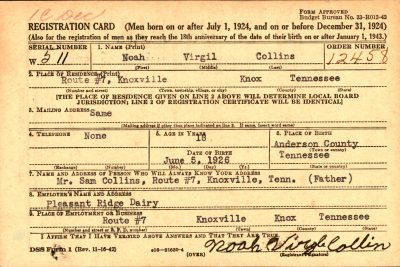 Noah Virgil Collins was born on 5 June 1926 in Anderson County, Tennessee, the son of Samuel “Sam” McKinley Collins and Maude Crawford.